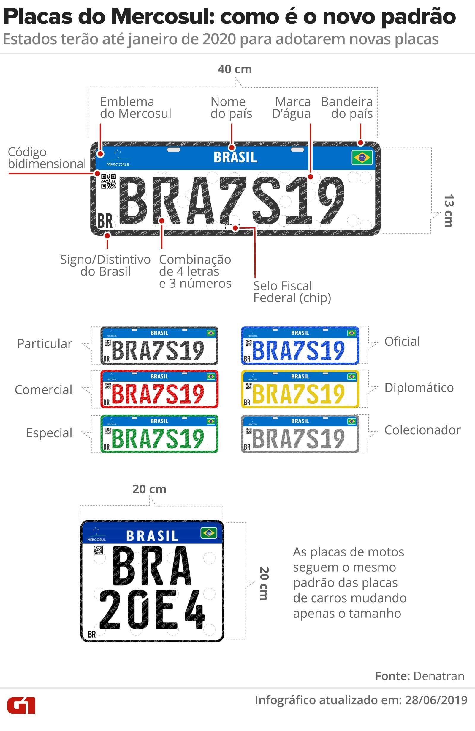 O novo padrão será válido para o primeiro emplacamento e, para quem tiver a placa antiga, no caso da troca de município ou propriedade. O novo modelo de placa usará a combinação de quatro letras e três números.