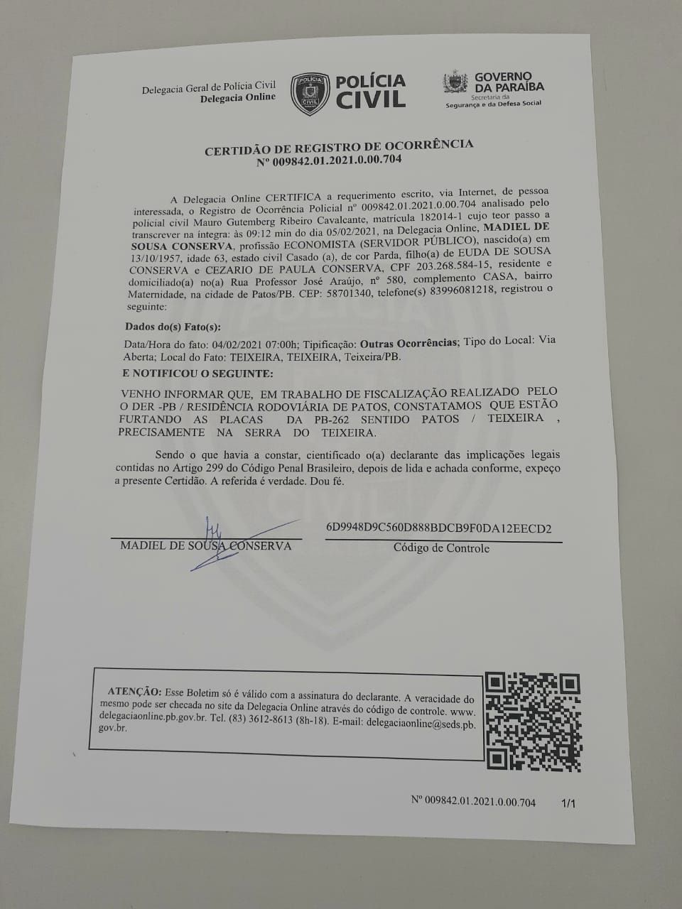 denunciar o furto das placas de sinalização na PB-262 que liga Patos a Teixeira.