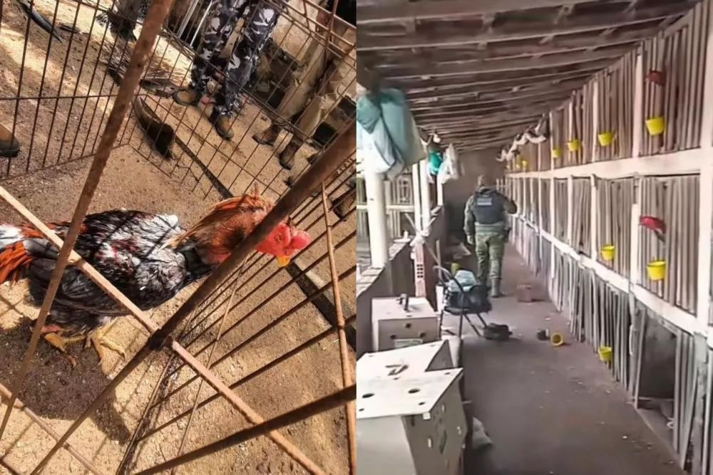 De acordo com a polícia, a intervenção ocorreu após denúncias apontarem maus-tratos a animais no local. Durante a fiscalização, os agentes encontraram 64 galos mantidos em condições precárias, em um ambiente sem ventilação adequada, sem acesso a água e alimentação, além de expostos a esgoto e forte odor.