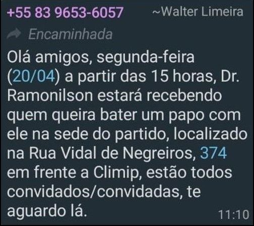 De acordo com Héber, reuniões com o pré-candidato Ramonilson Alves estariam sendo agendadas para a tarde desta segunda-feira, 20, na sede do partido, stuada a Rua Vidal de Negreiros, indo contra as recomendações das autoridades sanitárias no sentido de evitar aglomerações por conta da pandemia, se configurando em crime de desobediência.