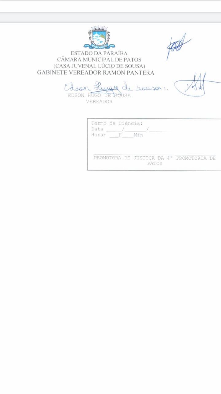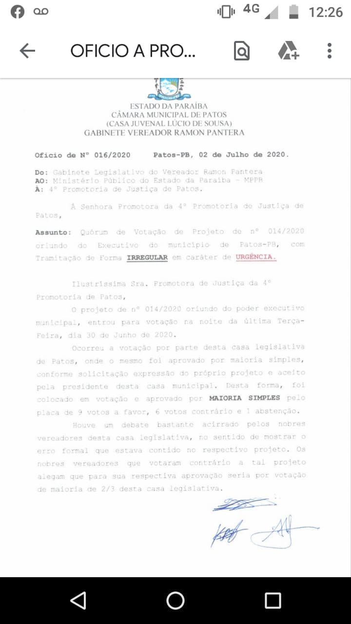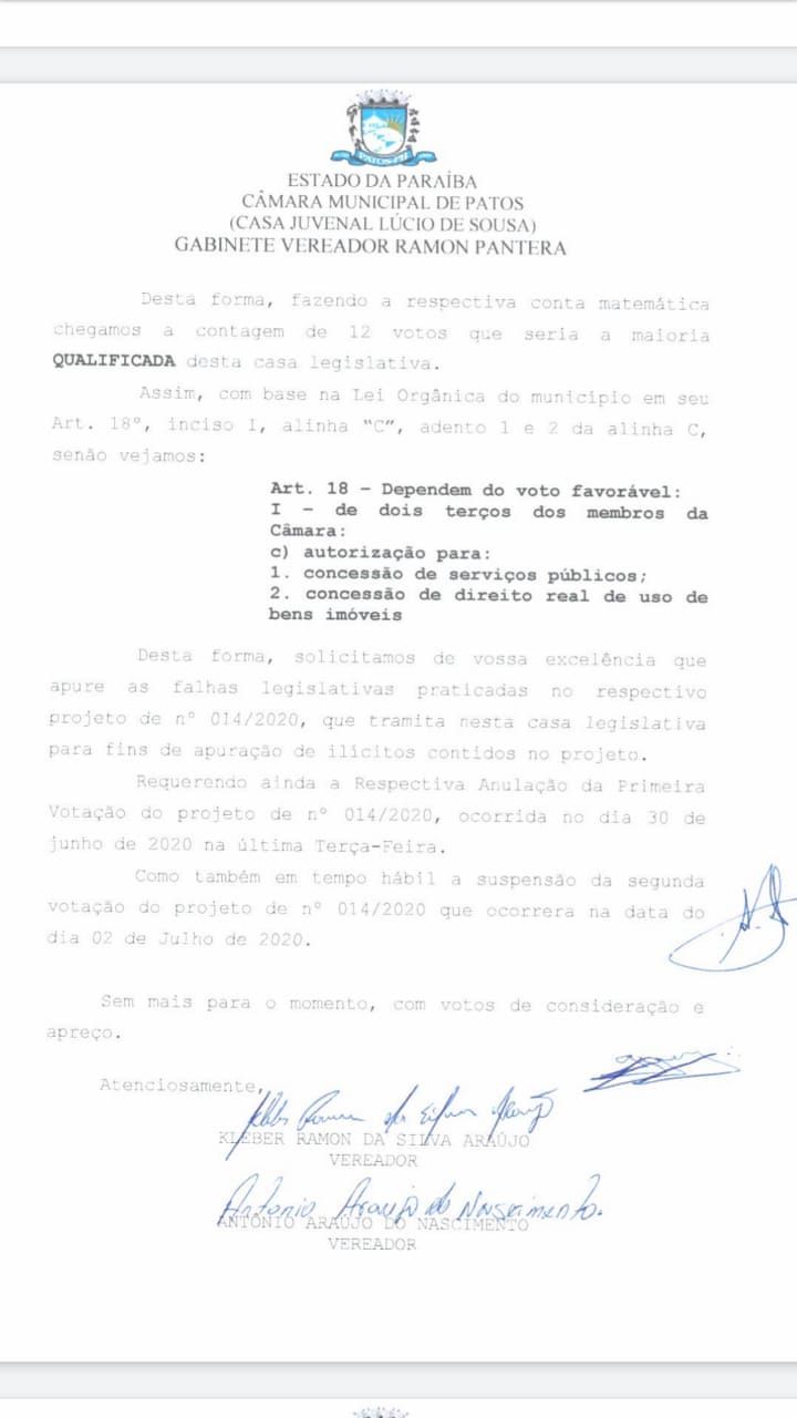 Os vereadores Ramon Pantera, Toinho Nascimento e Capitão Hugo, deram entrada na Quarta Promotoria de Justiça da Comarca de Patos, pedindo a anulação da primeira votação realizada na terça-feira, 30, que aprovou por 9 votos a 6 o Projeto de Lei do Poder Executivo, autorizando a doação do terreno onde está construído o Fórum Miguel Sátiro para o Tribunal de Justiça da Paraíba.
