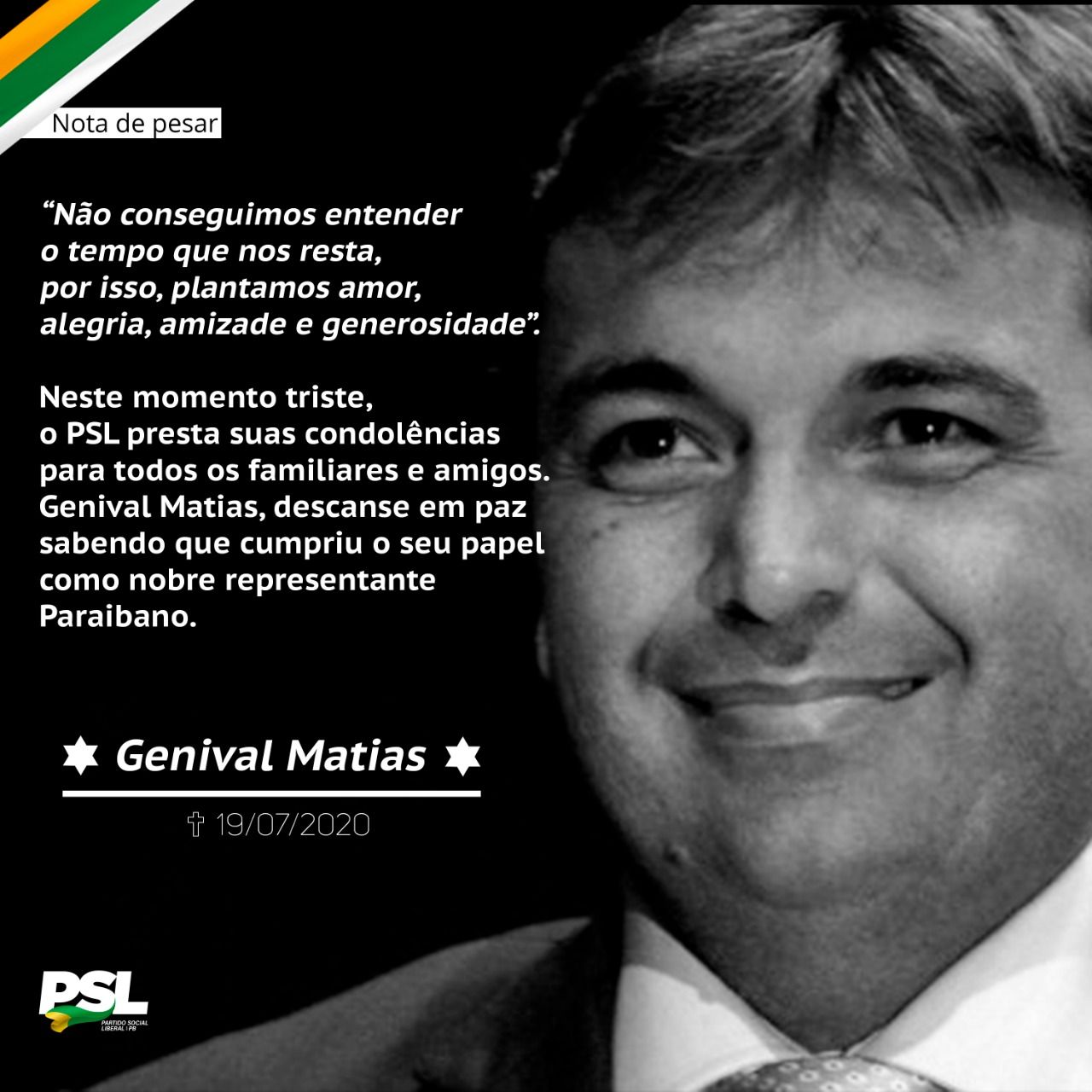 O PSL- PB (Partido Social Liberal Paraíba) presta sua homenagem ao parlamentar Genival Matias, deputado estadual por três mandatos, que nos deixa hoje, partindo para um lugar de paz, deixando o seu legado para o povo paraibano. Que neste Dia possamos recordar de sua hombridade, alegria e amizade.