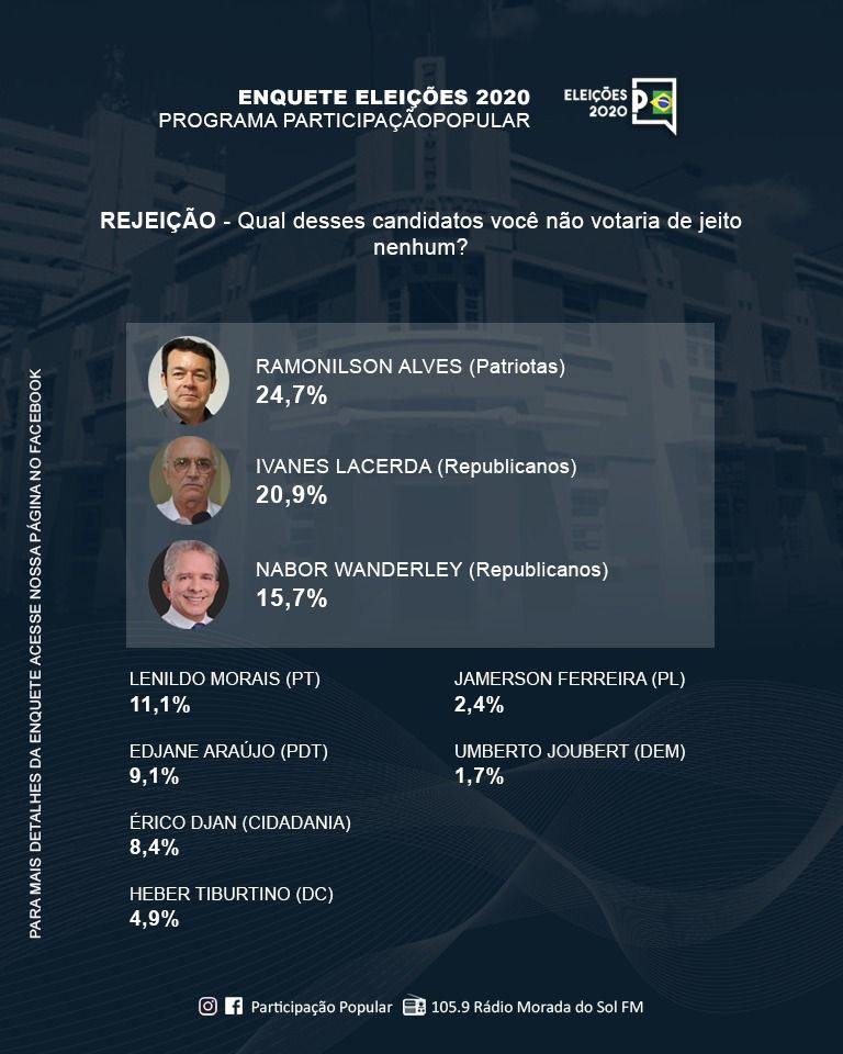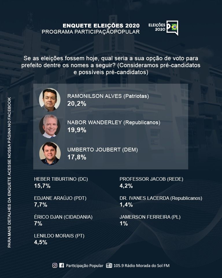O radialista Silvio Romero realizou uma enquete com os nomes dos pré-candidatos a prefeito de Patos nas eleições municipais em 2020. De forma espontânea pelo Facebook do programa Participação Popular, da Rádio Morada do Sol, sobre a aprovação e rejeição de possíveis candidatos ao cargo de Prefeito em Patos. A enquete teve duração de 7 dias, de 17 a 24 de julho e teve a participação de 287 internautas.