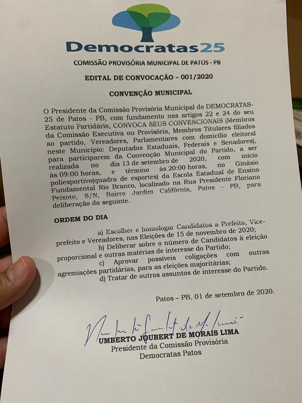 Umberto Joubert anuncia Convenção do Democratas em Patos, no próximo dia 11 de setembro