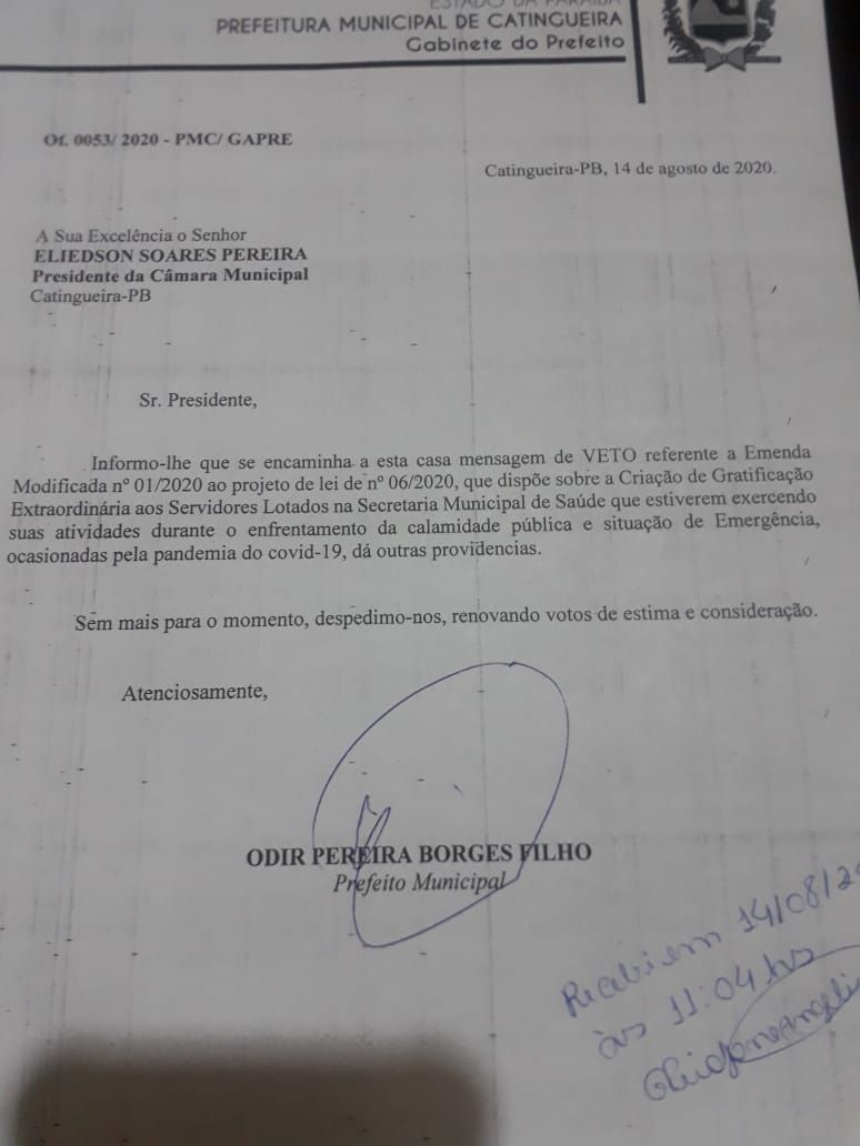 Prefeito de Catingueira, Dr. Odir, veta projeto que visa gratificar pessoal da saúde, mas Câmara derruba por unanimidade
