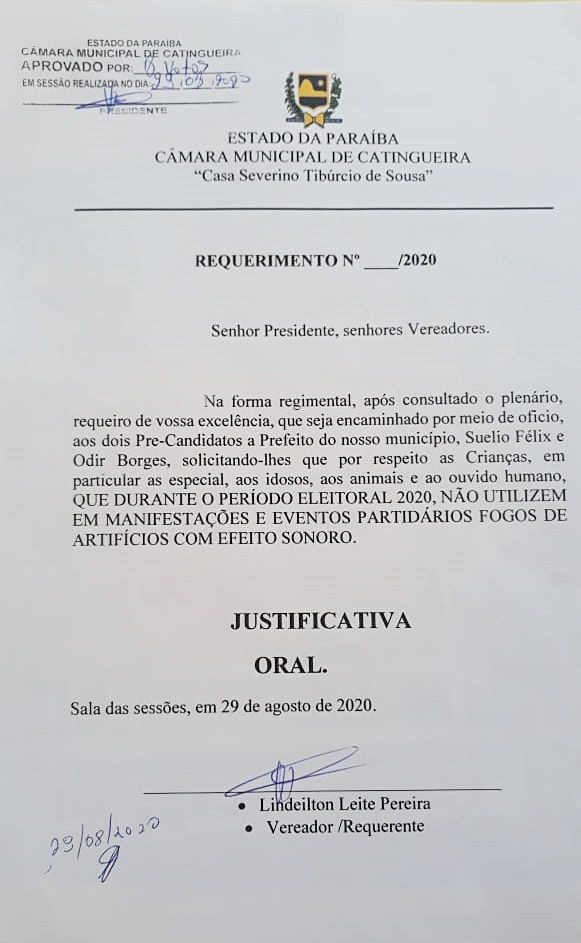 O vereador de Catingueira Lindeilton Leite (Democratas) apresentou um requerimento na Câmara Municipal solicitando das agremiações partidárias que não soltem fogos de artifício com efeitos sonoros em eventos políticos a serem realizados nos próximos dias, em virtude das eleições municipais, na cidade. O vereador justificou o seu pleito considerando que o barulho ocasionado pelos fogos causam incômodo a crianças autistas e a pessoas idosos.