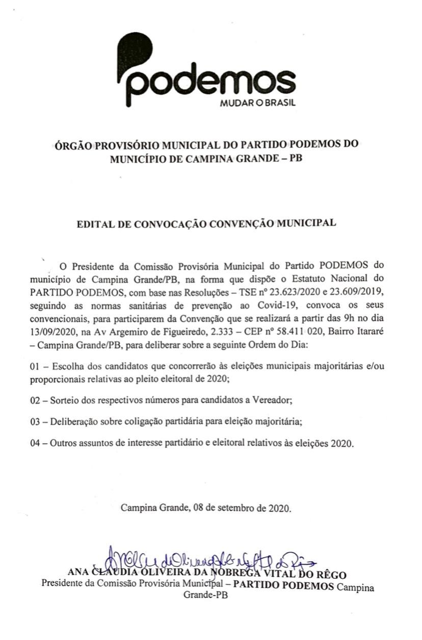 O Podemos marcou a sua Convenção Municipal em Campina Grande para o próximo domingo, dia 13 de setembro, a partir das 9h, para a homologação da candidatura de Ana Cláudia Vital para prefeita da cidade e dos candidatos do partido que irão disputar vaga na Câmara Municipal, nas eleições deste ano.