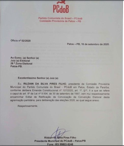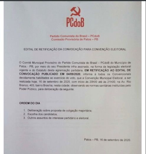 O partido do PC do B de Patos vai realizar sua convenção nesta quarta-feira(16), com início às 20h até 21h, na Avenida: Rio Branco, Nº 403, bairro da Brasília, em Patos-PB.