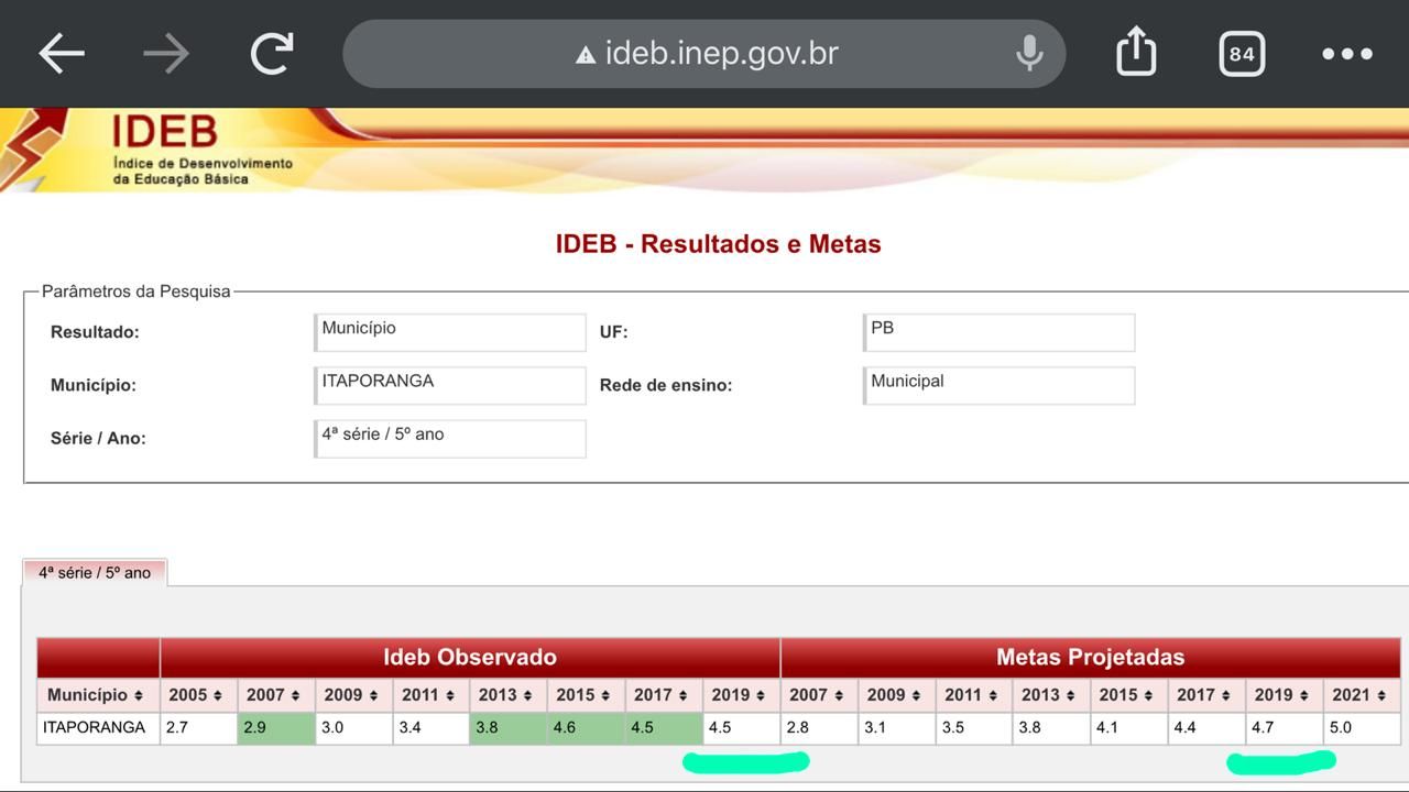 Em Itaporanga, maior cidade do Vale do Piancó, conforme demonstra o quadro em referência ao 5°ano, há quase quatro anos a meta não é atingida, o que traduz um descaso da gestão pública, na liderança do prefeito Divaldo, com estudantes, familiares e com toda a comunidade escolar.