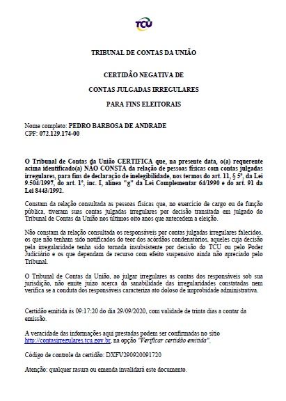 A reportagem entrou em contato com o candidato Pedro Barbosa, que afirmou está em dias com a Justiça Eleitoral. Ele disse que foram emitidos todos os documentos necessários para a sua candidatura e que uma certidão negativa foi emitida pelo Tribunal de Contas da União (TCU) onde consta que não há nenhuma irregularidade contra o candidato.
