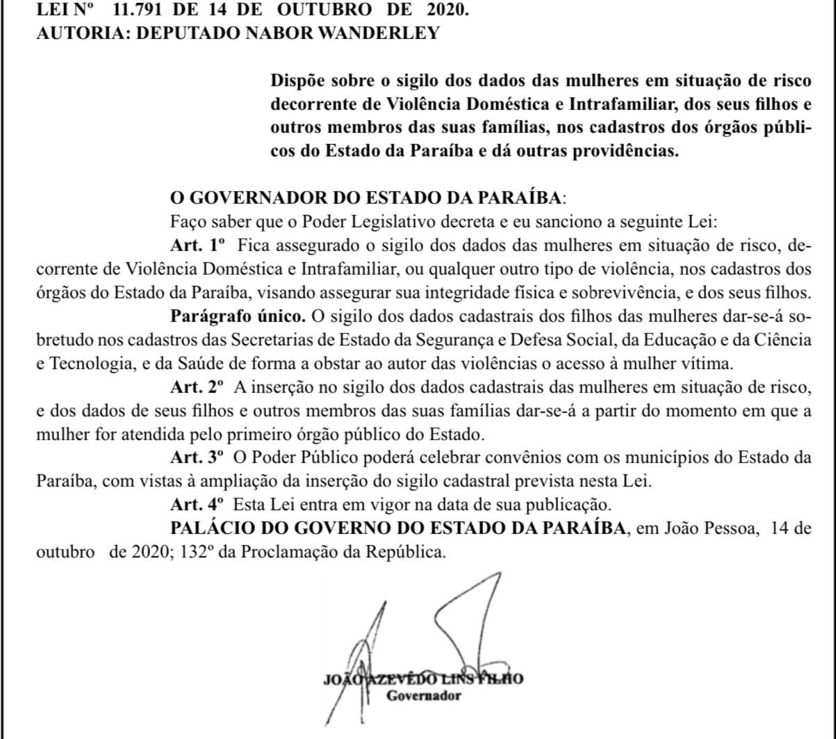 De autoria do deputado estadual Nabor Wanderley (Republicanos), a lei estadual de número 11.791/2020 garante o sigilo dos dados de mulheres em situação de risco em virtude de violência doméstica. A lei foi publicada no Diário Oficial do Estado, desta quinta-feira (15), e é extensiva também ao sigilo dos dados dos filhos e demais familiares da vítima.