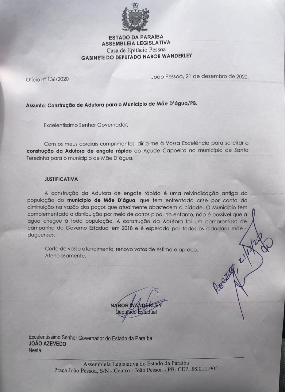 Preocupado com a falta de abastecimento de água, o deputado estadual Nabor Wanderley (Republicanos) e prefeito eleito de Patos solicitou ao governador João Azevedo (Cidadania) a construção de uma adutora de engate rápido do Açude Capoeira, no município de Santa Terezinha, para a cidade de Mãe D’água.