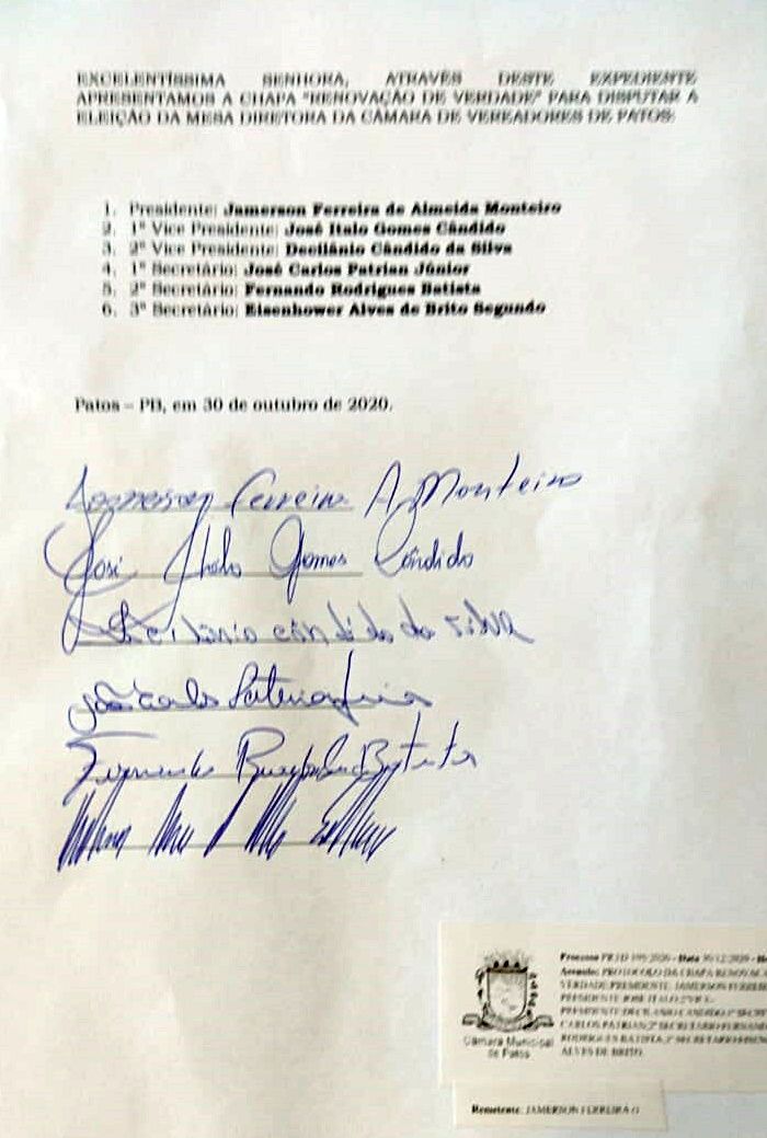 Vereadores protocolam Chapa de oposição para concorrer à presidência da Câmara de Patos