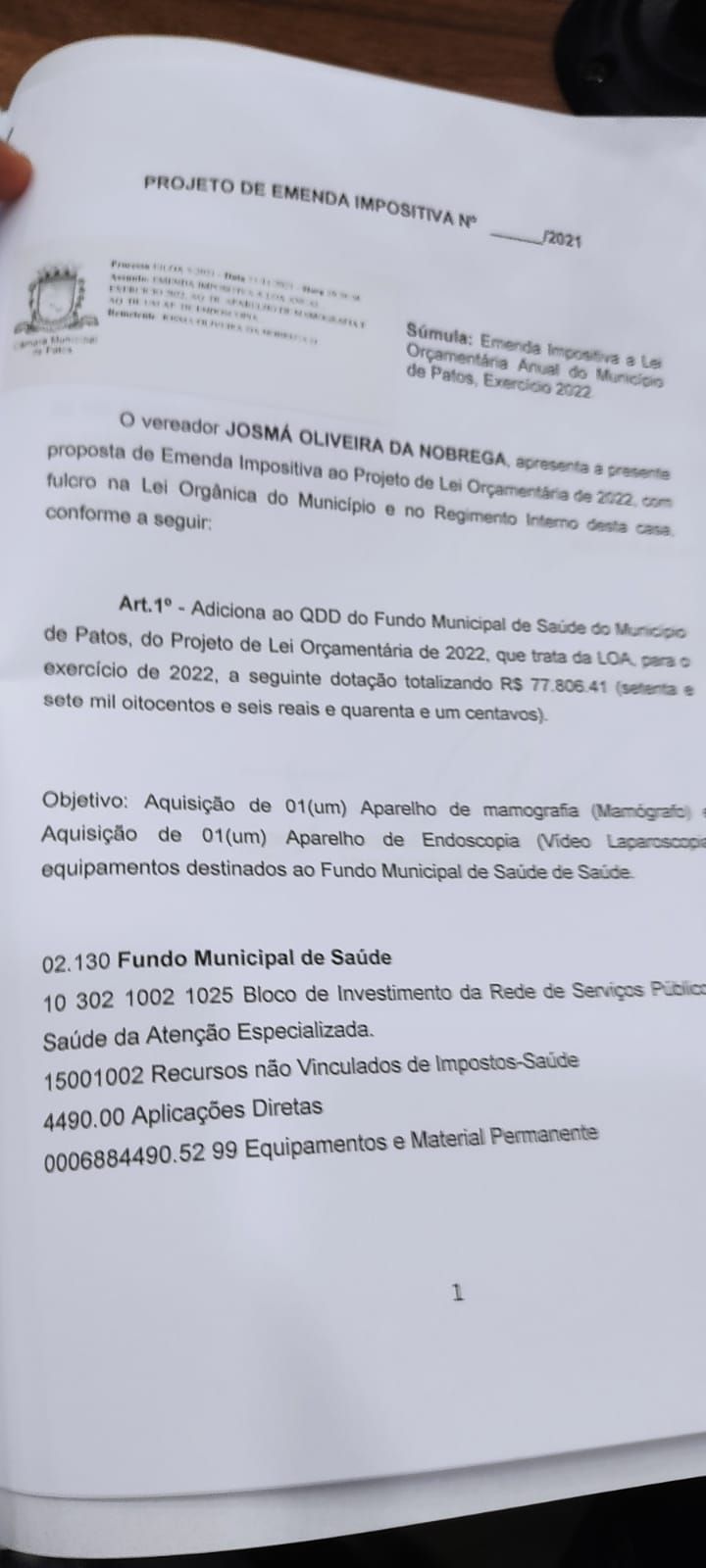 Uma Emenda Impositiva, do vereador Josmá Oliveira(Patriota), adicionada ao Projeto de Lei Orçamentária, que trata.da Lei Orçamentária Anual(LOA) para 2022, beneficiará centenas de patoenses, haja vista que servirá para a aquisição de um mamógrafo e um aparelho de endoscopia, destinados ao Fundo Municipal de Saúde e que serão utilizados por grande parte da população de Patos.