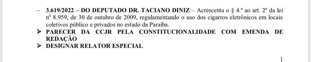 deputado Taciano Diniz(UB) que visa regulamentar o uso dos cigarros eletrônicos.
