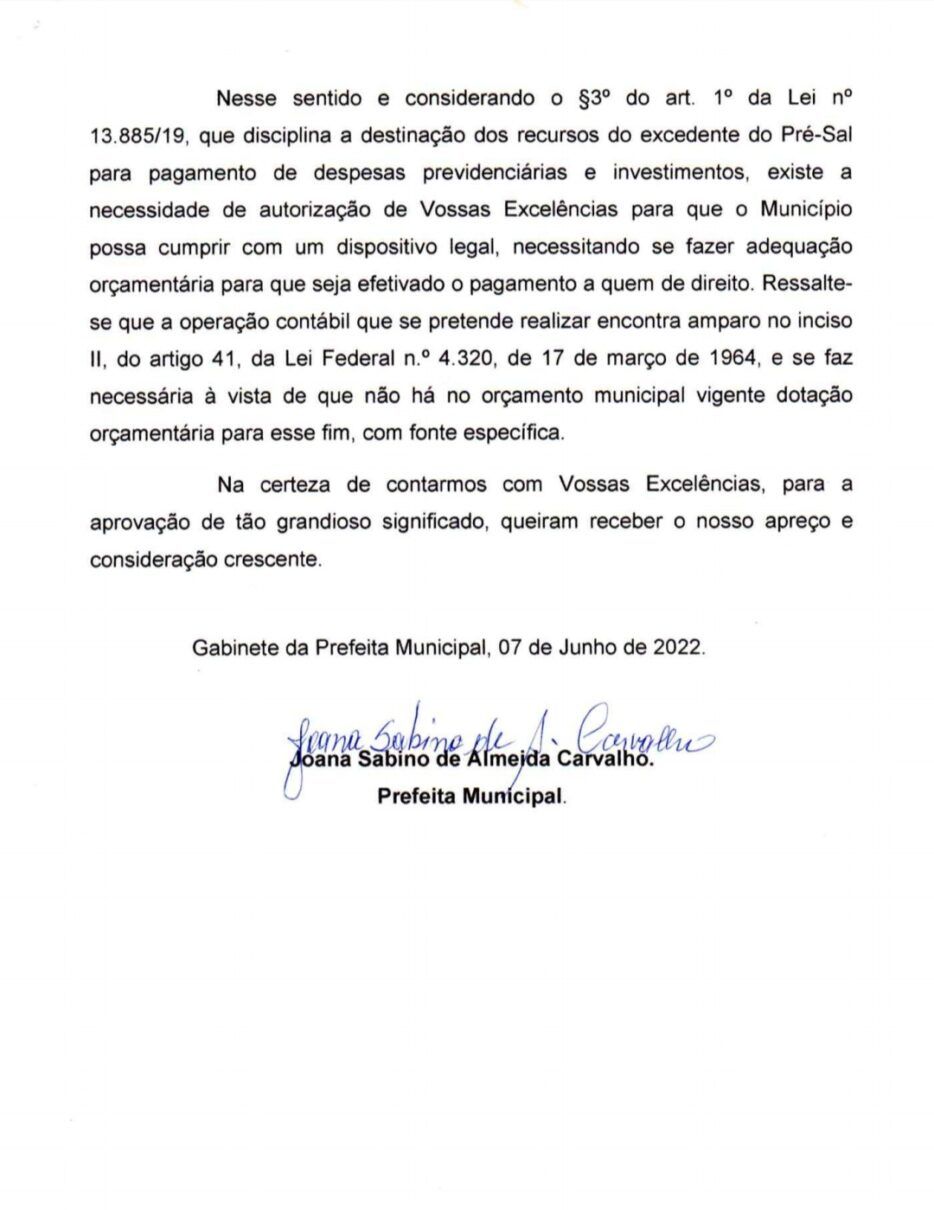 Os vereadores da oposição, Manoel Laurindo, Joana De Edval, João Batista, Fernando e Vandilson, na oportunidade, votaram contra a chegada do recurso de benefício popular do Pré Sal, que corresponde a um valor próximo de 142 mil reais e Vale creche no valor de um milhão, 120 mil reais.