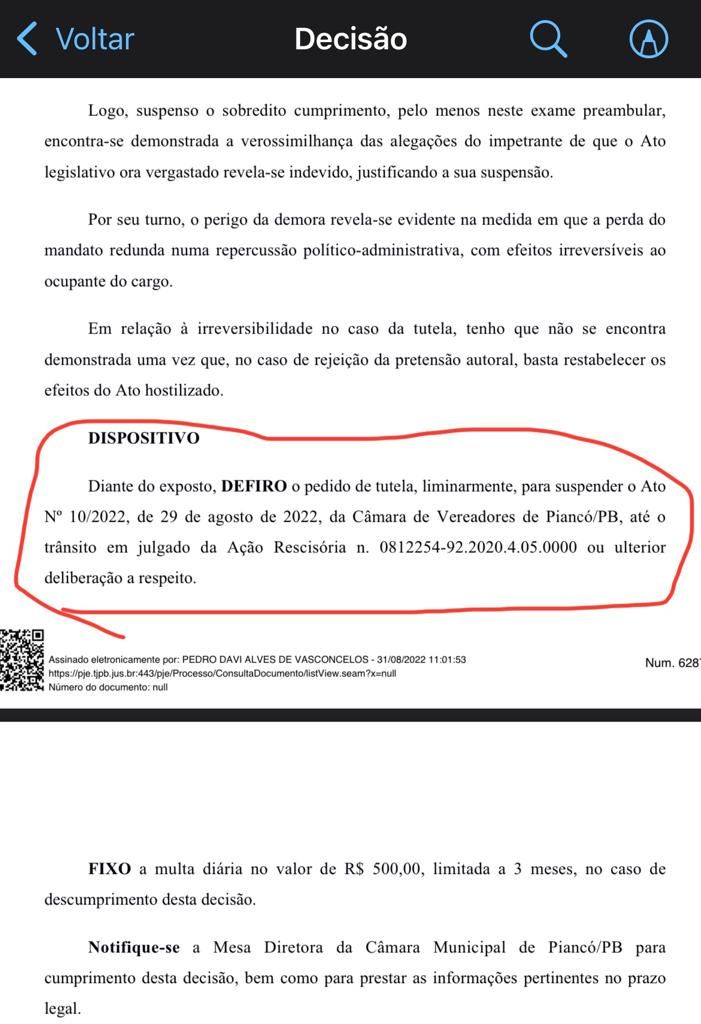 Após a Câmara Municipal votar e aprovar a cassação do vice-prefeito de´Piancó, Sales Lima (União Brasil), a Justiça concedeu uma liminar suspendendo a decisão da Câmara e ordenando que Sales volte ao cargo. Sobre essa polêmica, o Blog do Jordan Bezerra conversou com o vice-prefeito, por telefone, na tarde dessa quinta-feira, dia 1.