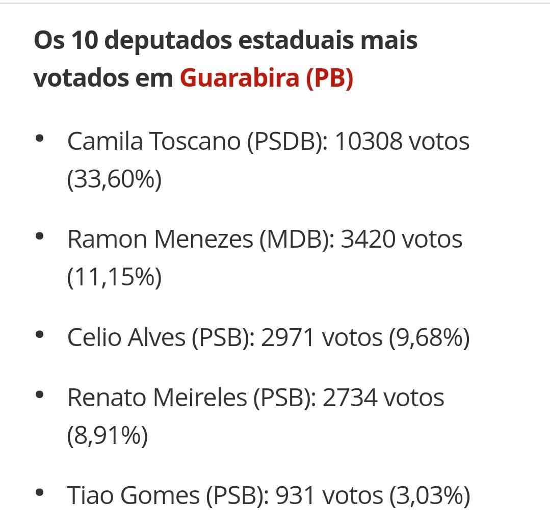 Camila valorizou a sua votação em Guarabira, onde conseguiu 10.308 votos, superando os 3.420 de Ramon Menezes (MDB), 2.971 de Célio Alves (PSB), 2.374 de Renato Meireles (PSB), e 931 de Tião Gomes (PSB), seus quatro principais concorrentes no município.