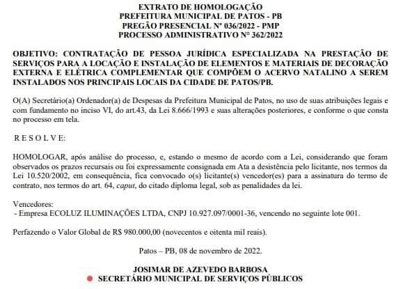 O vereador Josmá Oliveira, PL de Patos,através das mídias sociais denunciou aquilo que chama de "Natal milionário " , em relação aos gastos da prefeitura municipal com a ornamentação de algumas ruas da cidade, para a comemoração das festas natalinas.