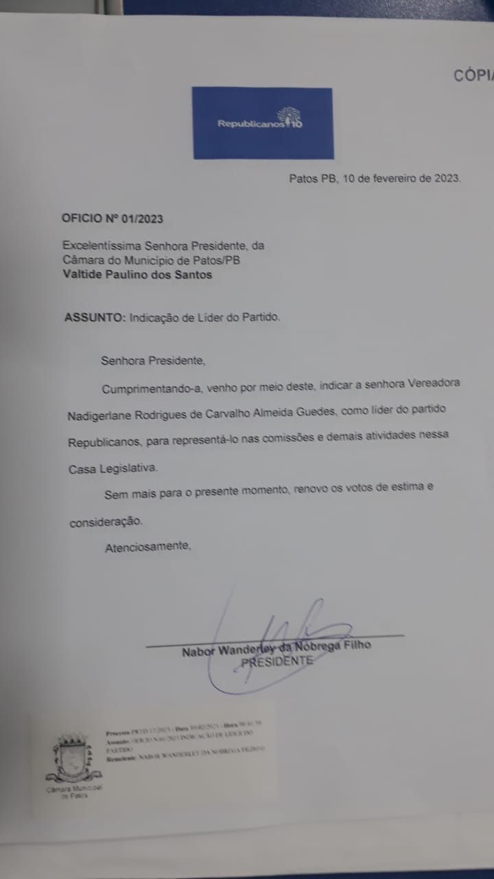 O prefeito da cidade de Patos, Nabor Wanderley, enviou um ofício à presidente da Câmara Municipal, Tide Eduardo, indicando a vereadora como líder do partido, para representar o Republicanos nas comissões e demais atividades da Casa.