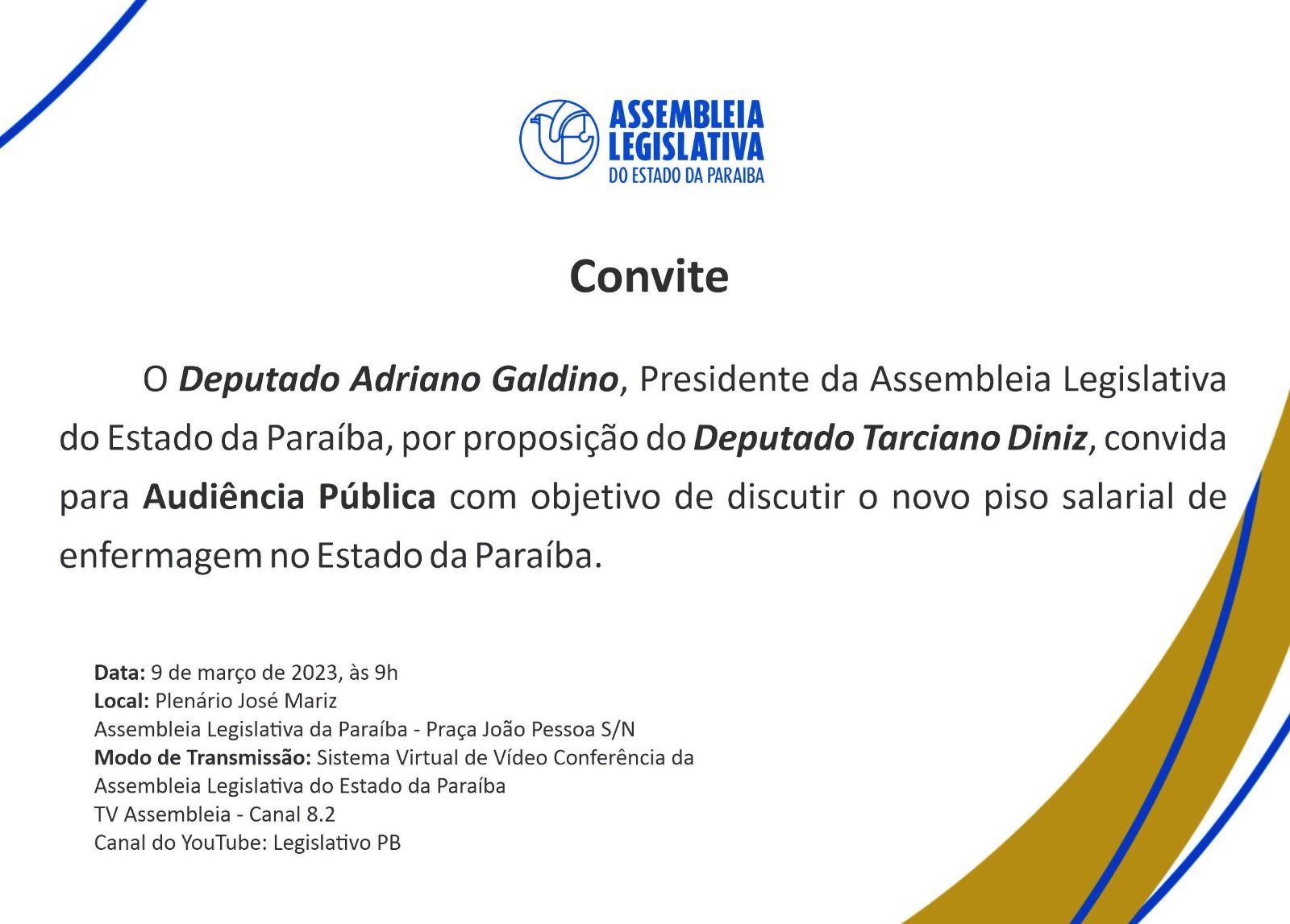 O deputado estadual Taciano Diniz propôs à Assembleia Legislativa a realização de uma Audiência Pública com os demais parlamentares para discutirem a falta de pagamento do piso salarial de enfermeiros na Paraíba. O piso foi determinado por lei federal e já deveria estar sendo pago a todos os funcionários ligados à categoria.