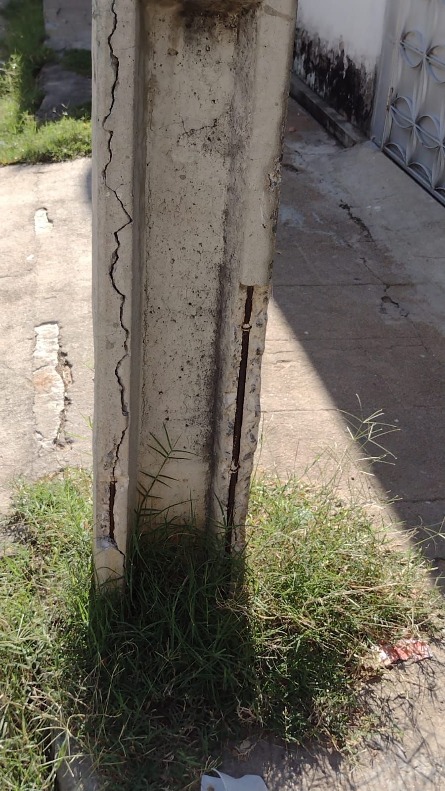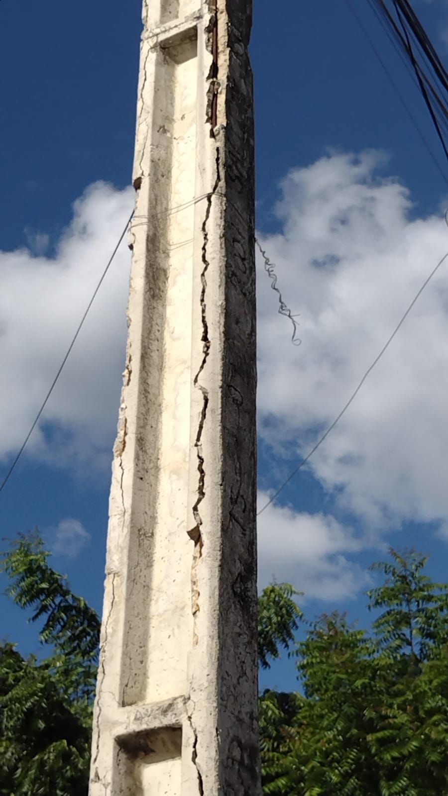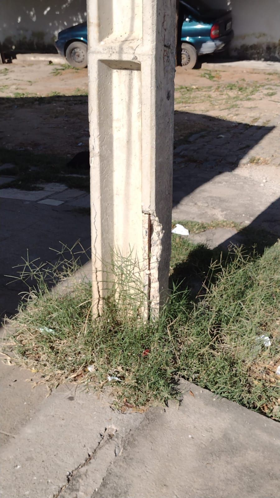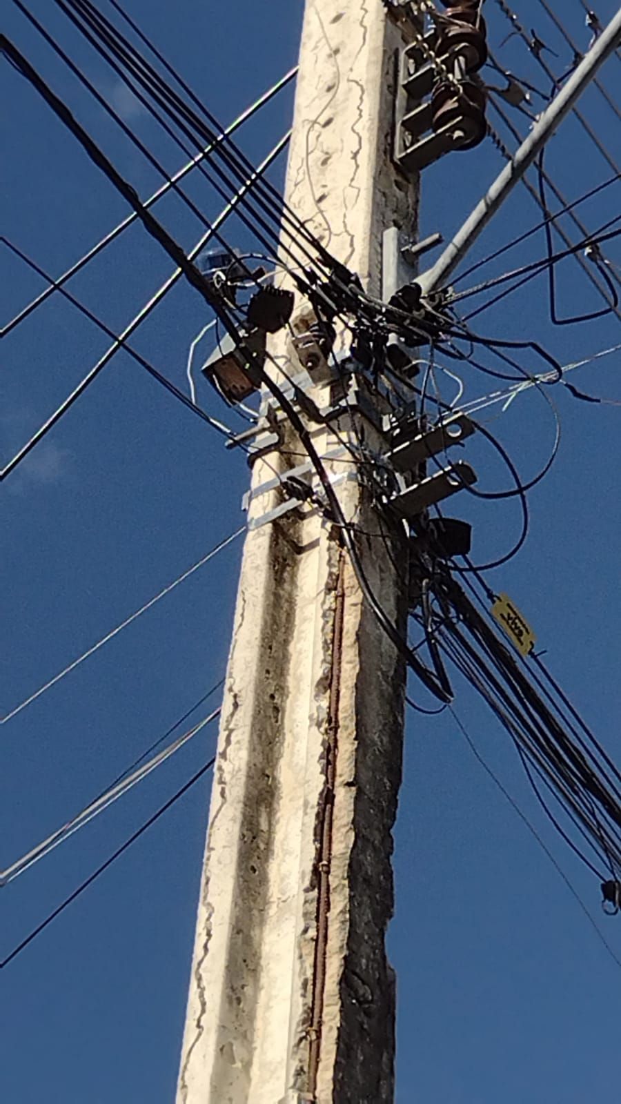 De acordo com a denúncia de Ricardo, o poste tem rachaduras em toda a sua estrutura, desde a base até o topo. Nas imagens também é possível ver que a estrutura de ferro do poste já está aparende, uma vez que o concreto rachou e caiu.