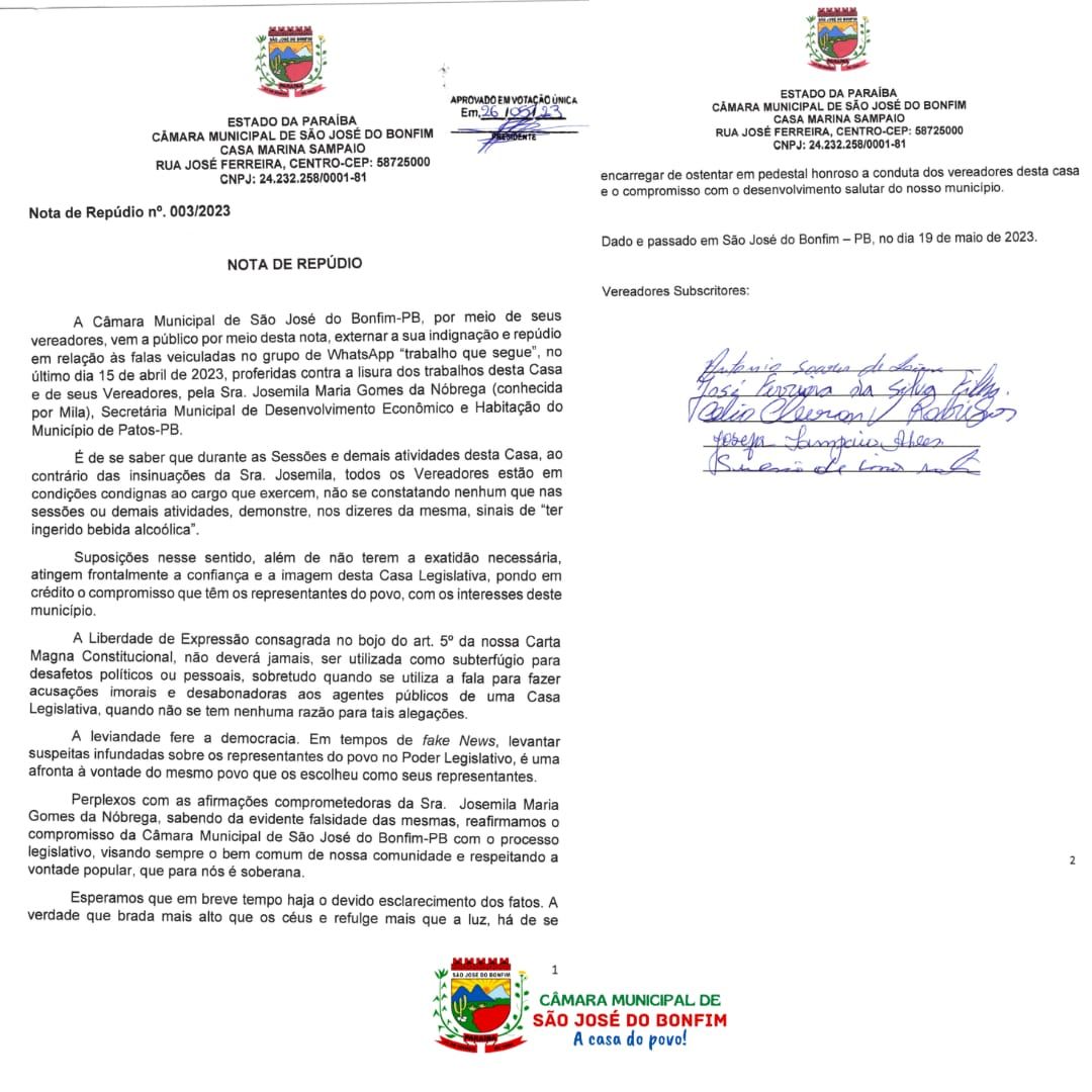 A Câmara Municipal de São José do Bonfim aprovou na noite desta sexta-feira, dia 26 de maio, durante a Sessão Ordinária, um voto de repúdio a ex-secretária do município e atual secretária de Desenvolvimento Econômico e Habitação de Patos, Mila Nóbrega.
