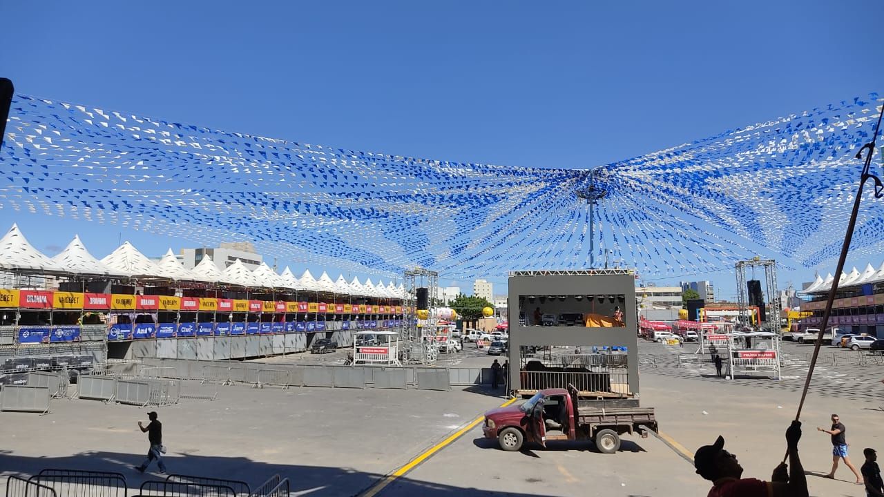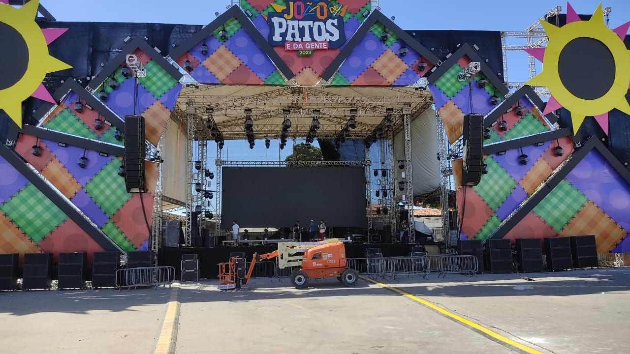 O palco tem uma grande estrutura. As bandeirinhas já foram colocadas e todo o espaço se encontra pronto para receber as atrações. As equipes de produção estão ajustando os últimos detalhes para o evento, que começa na noite de hoje.