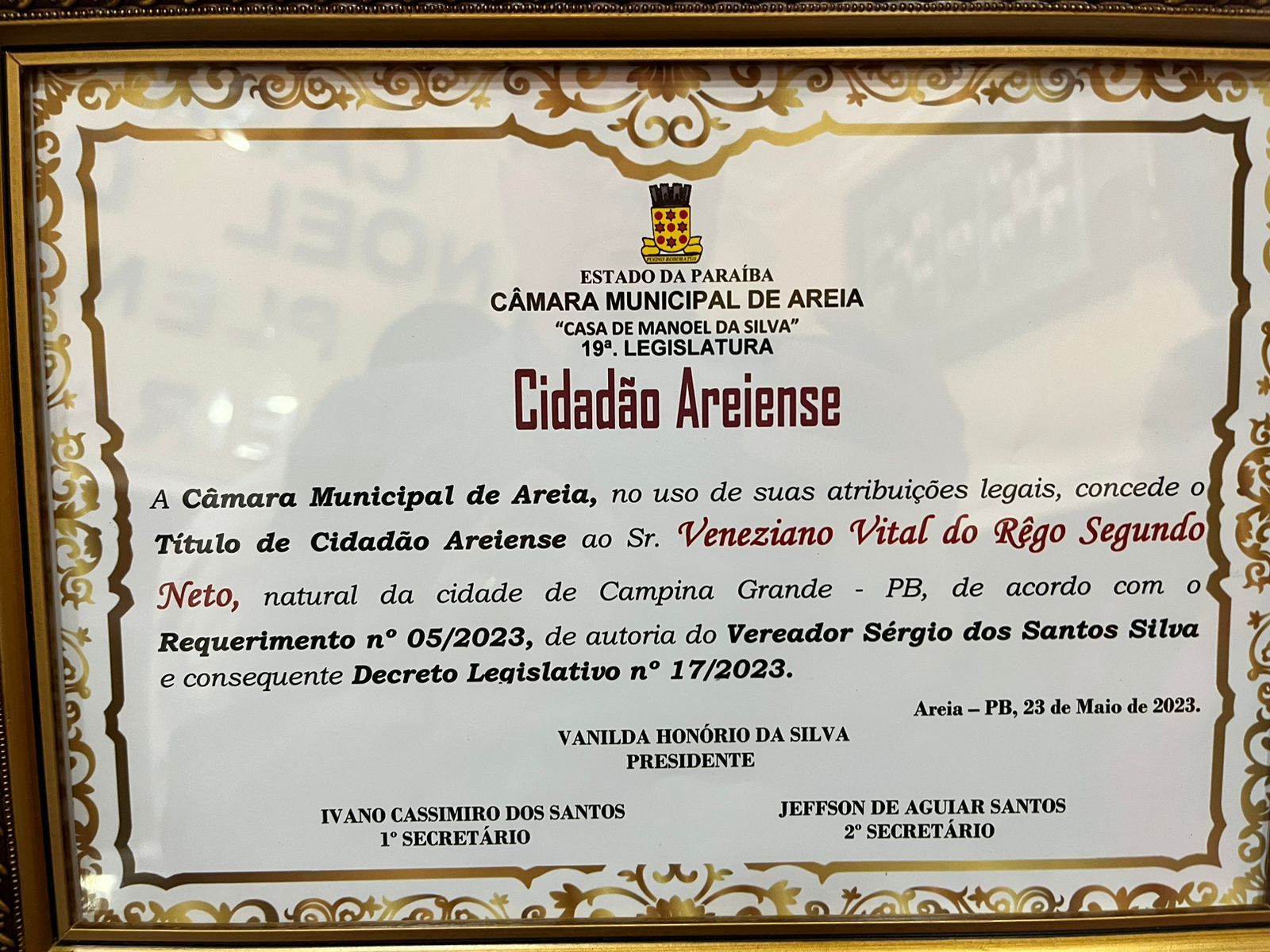 O Vice-Presidente do Senado Federal, Senador Veneziano Vital do Rêgo (MDB-PB) recebeu nesta sexta-feira (07) o título de Cidadão Areiense. A solenidade ocorreu na Câmara Municipal da cidade e contou com a presença de diversas autoridades. O autor da propositura foi o vereador Sérgio dos Santos Silva.
