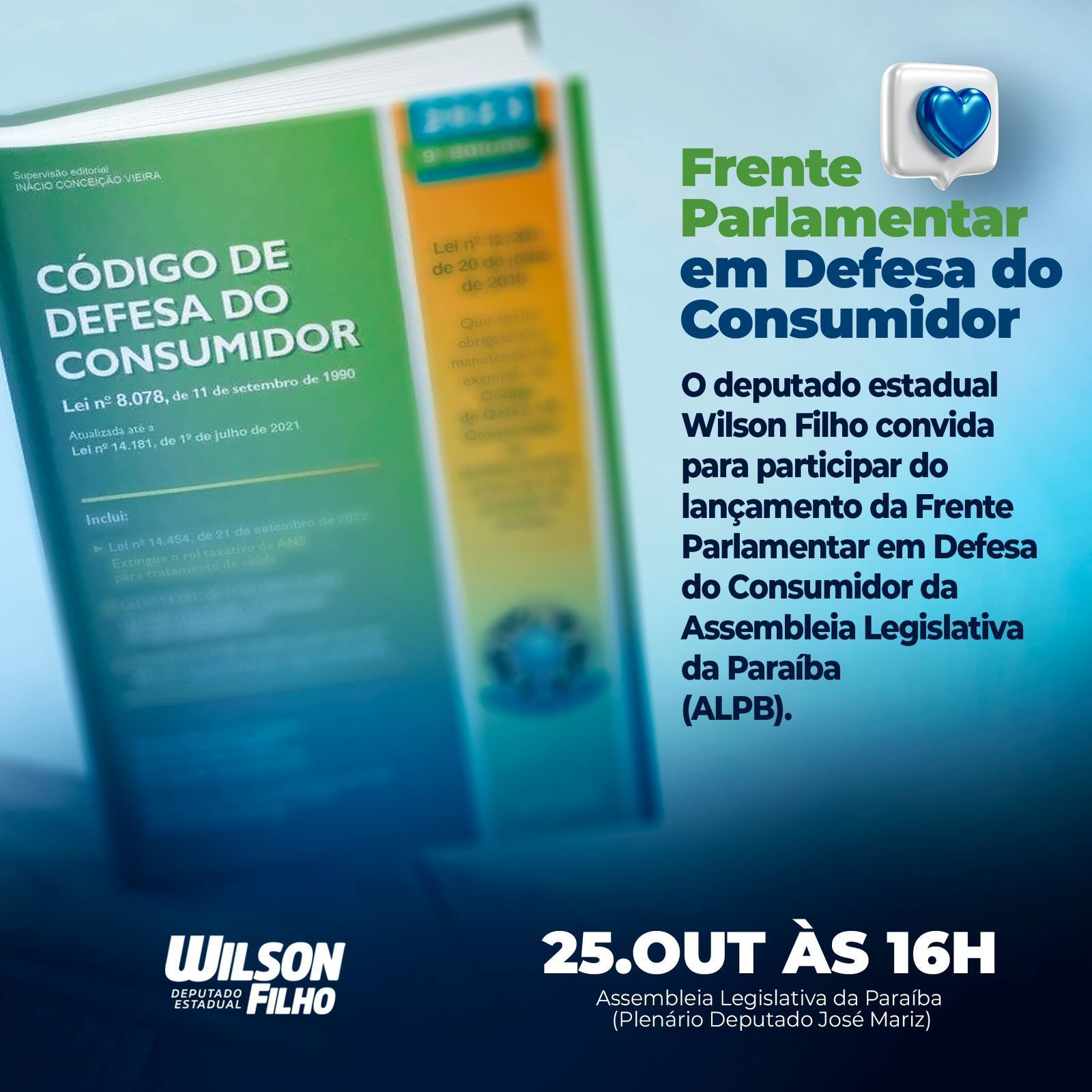 A Assembleia Legislativa da Paraíba (ALPB) lança na próxima quarta-feira (25) a Frente Parlamentar em Defesa do Consumidor. A solenidade acontecerá às 16h, no Plenário José Mariz. O presidente da Frente, o deputado estadual Wilson Filho (Republicanos) antecipou que um dos objetivos principais nesse primeiro momento é trabalhar na elaboração de matérias legislativas que possam ajudar os paraibanos a sair da situação de endividamento.