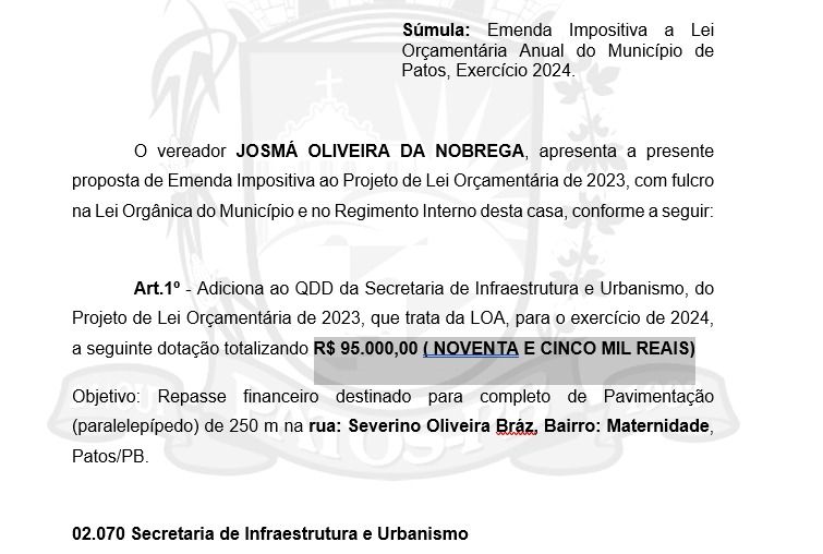 Localizada no bairro da Maternidade/Jardim Guanabara, a rua Severino Oliveira Braz acaba de ser beneficiada com uma verba no valor de 95 mil reais, proveniente de Emenda Impositiva, sendo o responsável o vereador Josmá Oliveira, PL, visando o calçamento daquele logradouro público e atendendo apelos de moradores da localidade.