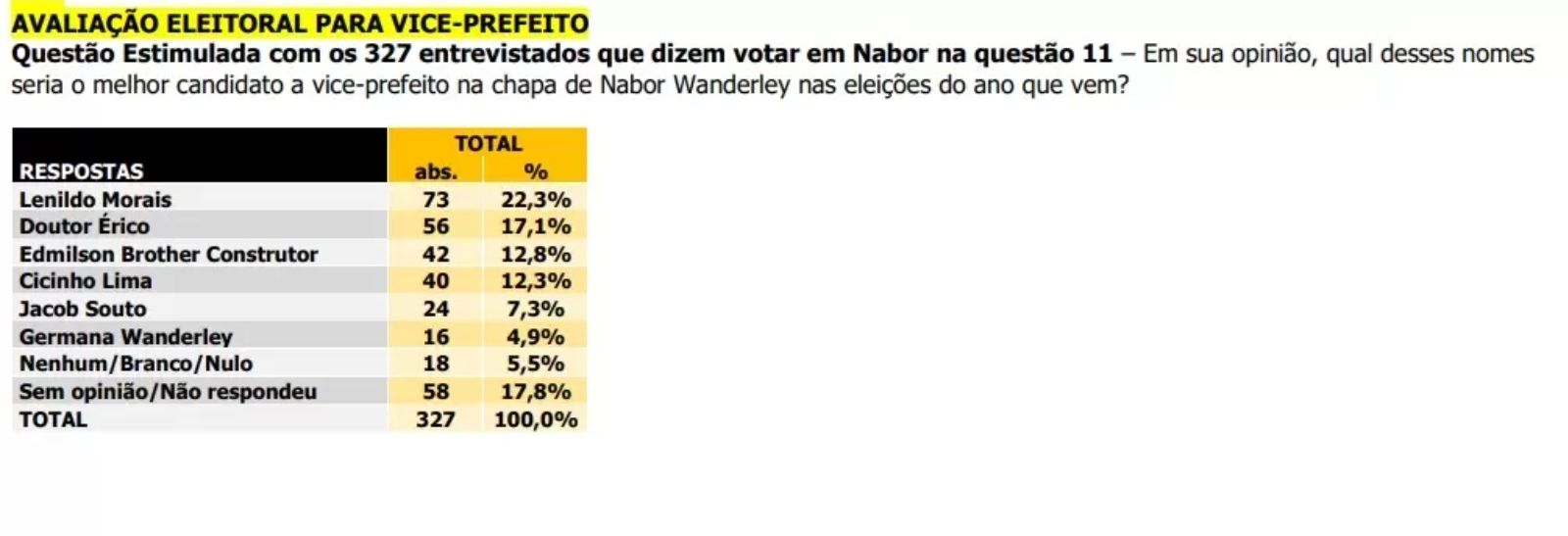 Segundo o instituto, Lenildo recebeu o apoio de 22,7% dos 327 eleitores que indicaram votar em Nabor nas eleições de 2024, seguido pelo ex-deputado estadual Dr. Érico Djan, com 56 indicações e 17,1%.