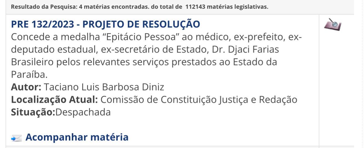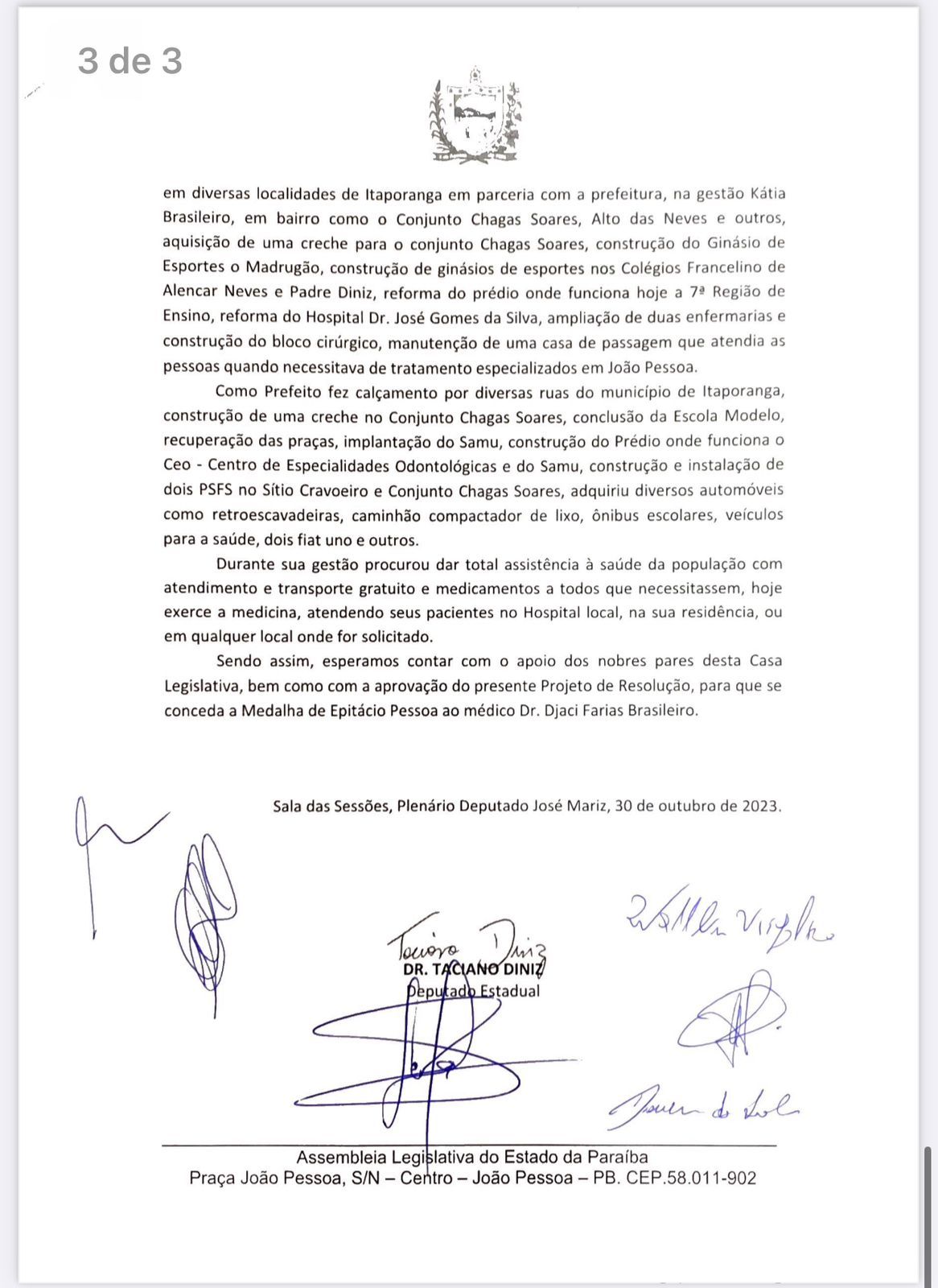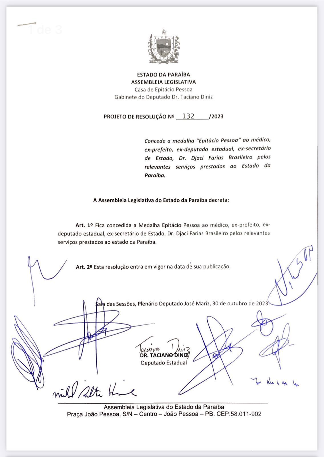 Na 47ª Sessão Ordinária Híbrida, da 20ª Legislatura, da Assembléia Legislativa da Paraíba (ALPB), desta quarta-feira, 29 de novembro de 2023, foi aprovado o Projeto de Resolução n° 132 /2023, de autoria do deputado estadual Dr. Taciano Diniz, concedendo a medalha “Epitácio Pessoa” ao médico, ex-prefeito, ex-deputado estadual e ex-secretário de Estado, Dr. Djaci Farias Brasileiro pelos relevantes serviços prestados ao Estado da Paraíba.