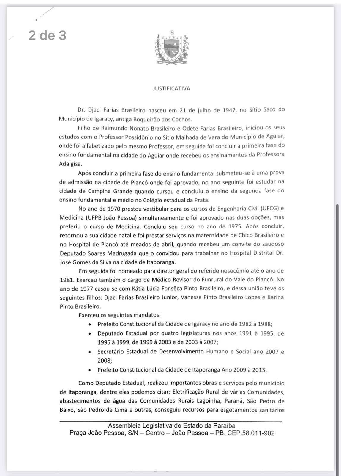 Dr. Djaci Brasileiro, foi prefeito do município de Igaracy, entre os anos de 1983 à 1988, deputado estadual por 4 legislaturas, entre os anos de 1991 à 2007, Secretário Estadual de Desenvolvimento Humano e Social, nos anos de 2007 e 2008, e prefeito do município de Itaporanga, entre os anos de 2009 à 2012; também exerce a medicina na condição de cirurgião geral desde o ano de 1975, quando concluiu o curso, e até os dias atuais realiza atendimentos e realiza cirurgias em prol dos paraibanos, o que o permitiu prestar relevantes serviços na vida pública e privada ao estado da Paraíba.