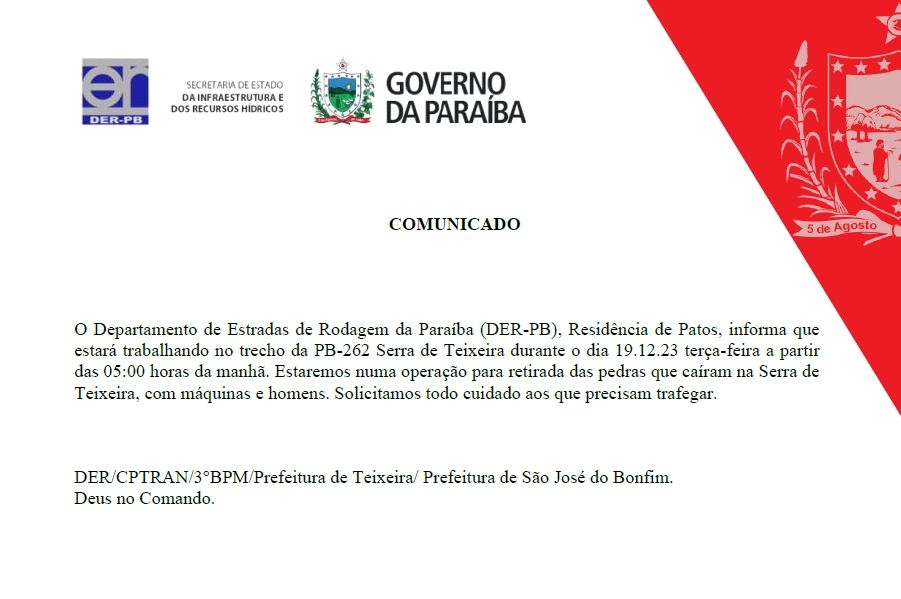 Em contato com a reportagem do Blog do Jordan Bezerra, nesta segunda-feira, dia 18, o chefe do Departamento de Estradas e Rodagens da Paraíba em Patos (DER-PB), Madiel Conserva, informou a todos os motoristas da região metropolitana que as equipes estarão realizando serviços de manutenção no trecho da rodovia PB-262, na Serra de Teixeira, na manhã dessa terça (19).
