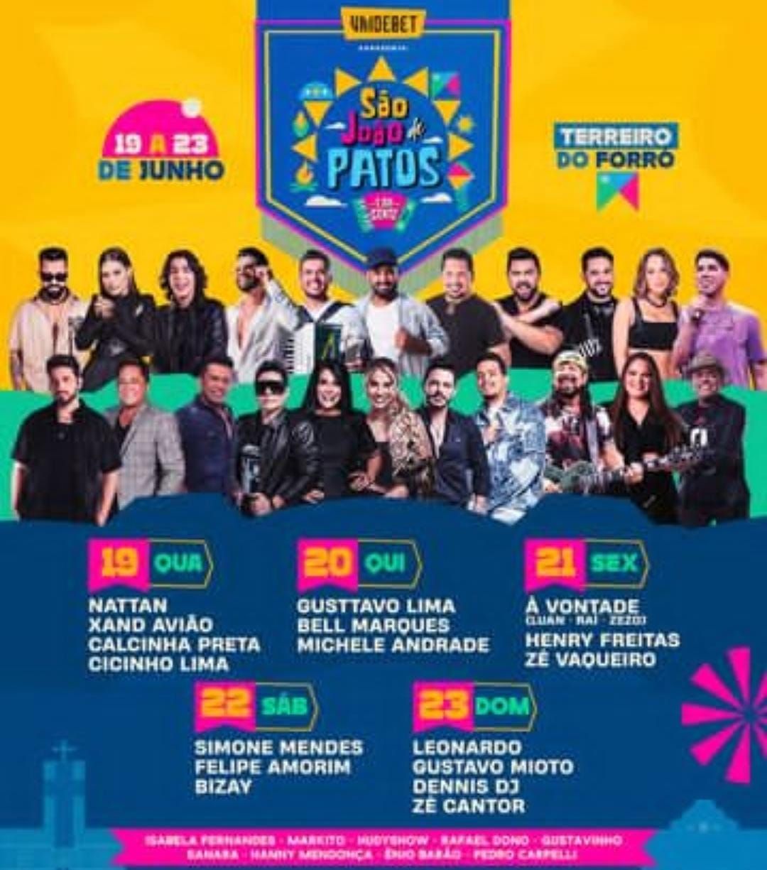O São João de Patos 2024 acontece do dia 19 ao dia 23 de junho, reunindo nomes tradicionais no evento, como Xand Avião, Gusttavo Lima, Leonardo e Henry Freitas. Bandas como Calcinha Preta e outas foram anunciadas.
