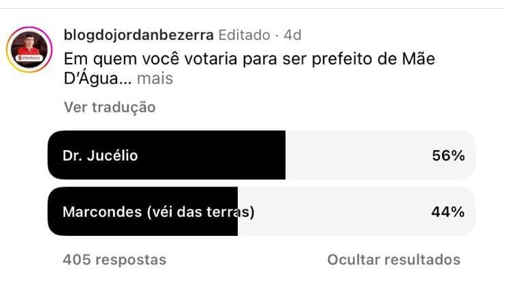 Ao todo, 405 pessoas participaram da enquete, que envolveu a população de Mãe D'água, e que também comentou na postagem justificando os votos. Para ver mais detalhes, é só ir ao perfil do Blog do Jordan Bezerra no instagram.
