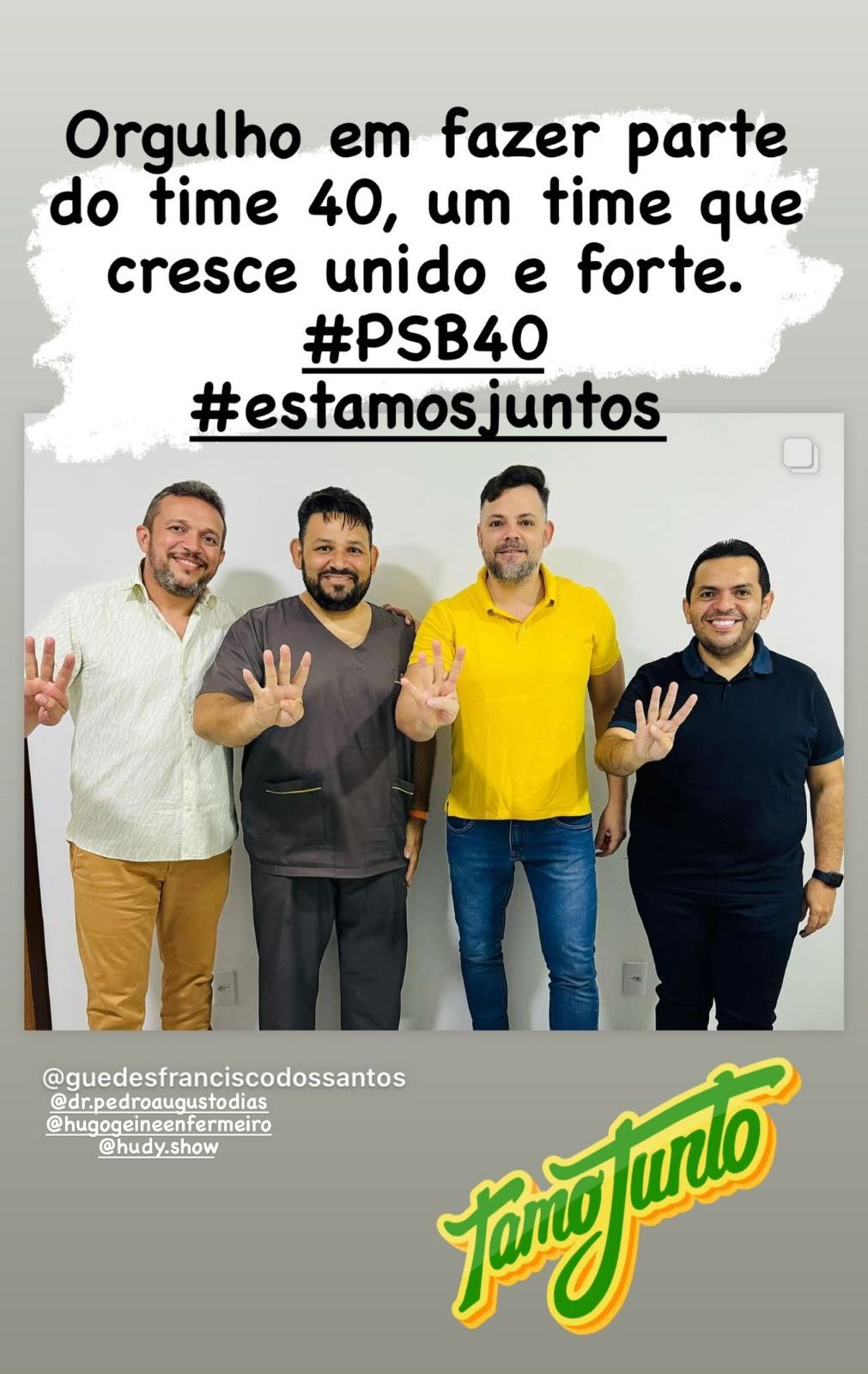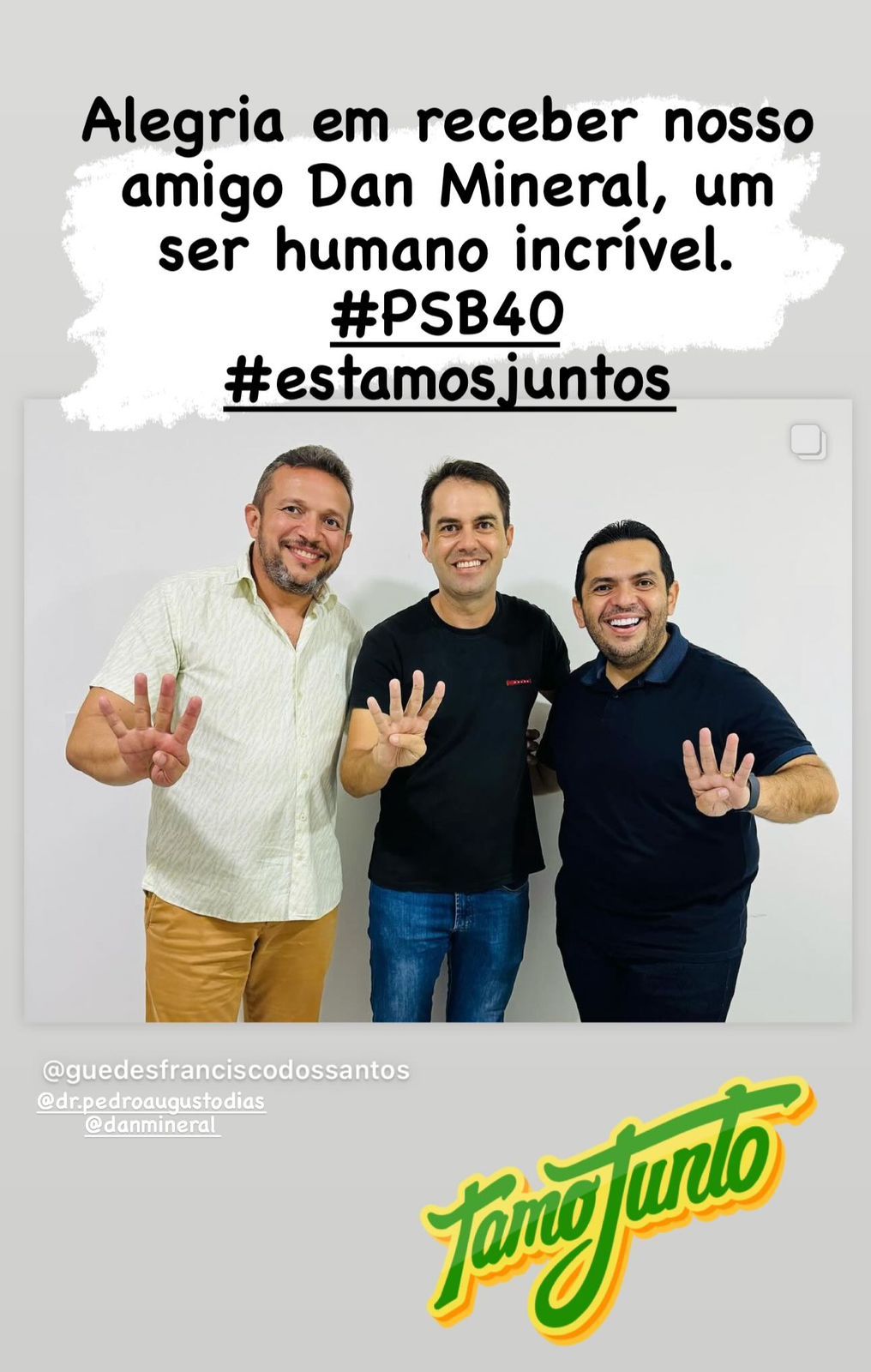 "O nosso PSB 40 segue avançando na formação de um grande time forte e campeão, tivemos a honra e alegria de receber o apoio nesta tarde de quinta-feira dos amigos Dan Mineral e Hugo Enfermeiro irmão do grande mestre Hudy Show, ambos seguirão firmes e fortes rumo a uma vaga na Câmara Municipal de Patos, o PSB que segue coligado com o Republicano caminham de mãos dadas rumo a um novo tempo. Gratidão ao nosso amigo Prefeito Nabor Wanderley por todo apoio, o Governo do Estado caminha junto com o município de Patos e não restam dúvidas que os cidadãos dessa querida cidade só tem a ganhar com essa parceria", disse ele.