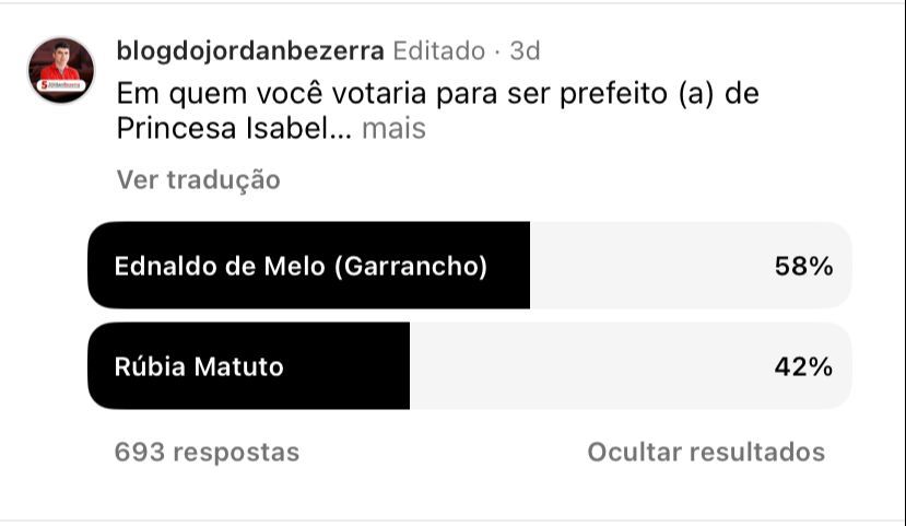 Ao todo, a enquete contou com a participação de 693 internautas, que também deixaram commentários. Os resultados estão no perfil do Blog do Jordan Bezerra no Instagram. A enquete tem finalidade exclusivamente informativa, sem caráter científico.