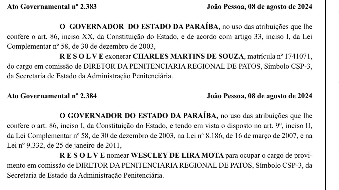 Sem explicação: diretor do Presídio Romero Nóbrega de Patos, Charles Martins, é exonerado