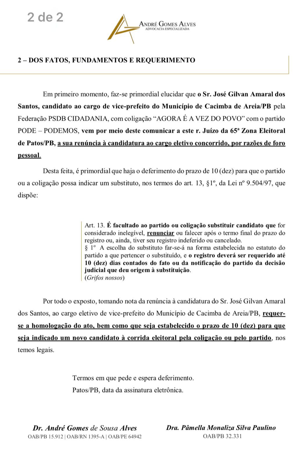 José Gilvan, residente na zona rural de Cacimba de Areia, no Sítio Cacimba de Bois, apresentou o pedido de renúncia em conformidade com a Lei n° 9.504/97, que rege as normas eleitorais no Brasil. Com base na legislação, o partido ou a coligação terá um prazo de 10 dias para indicar um substituto ao cargo de vice-prefeito, conforme estabelecido no artigo 13, parágrafo 1º da referida lei.