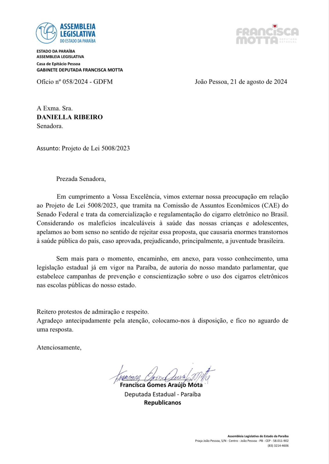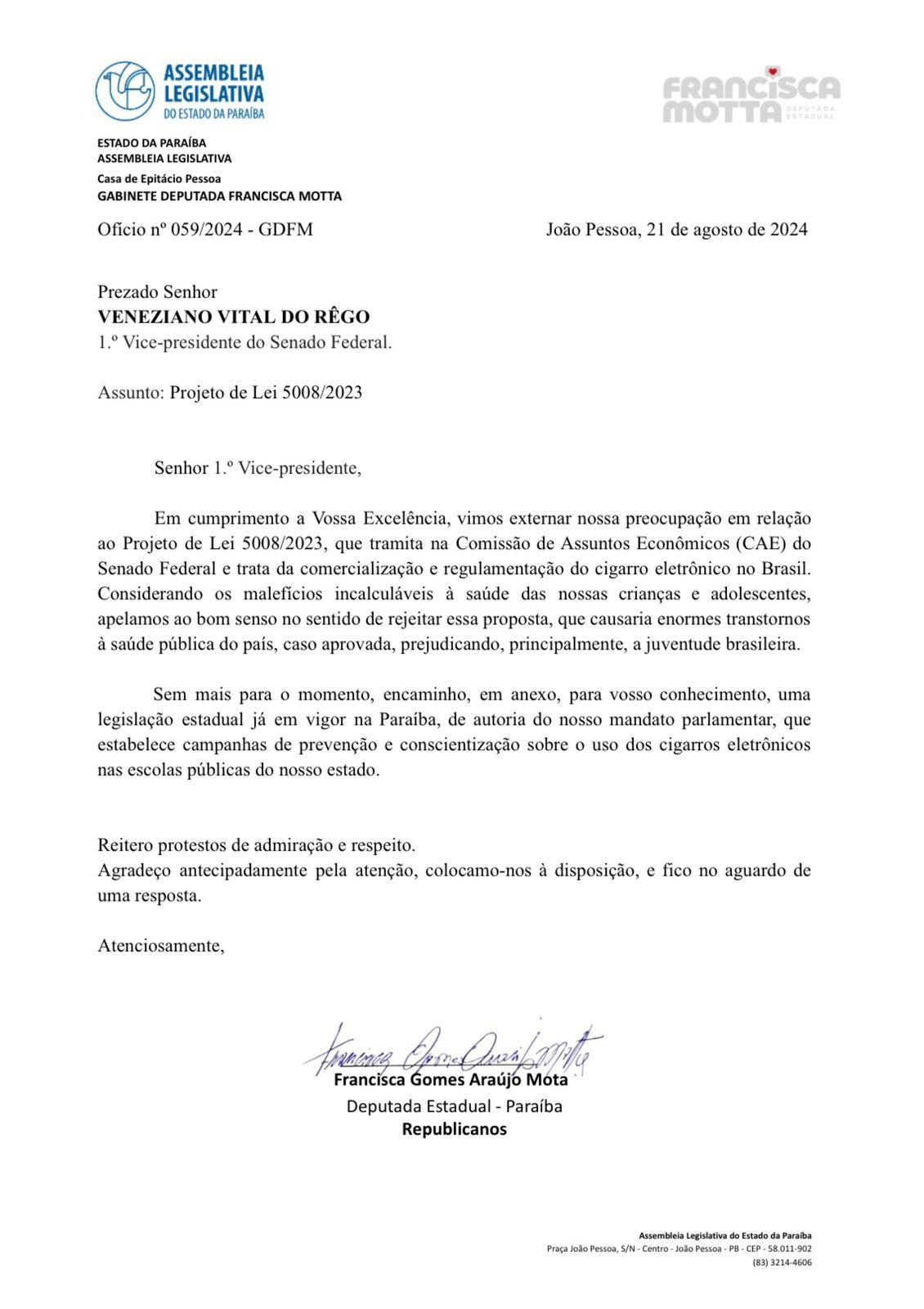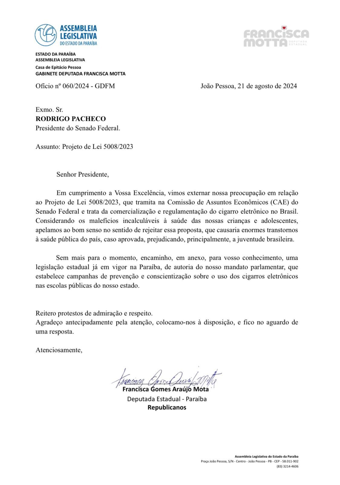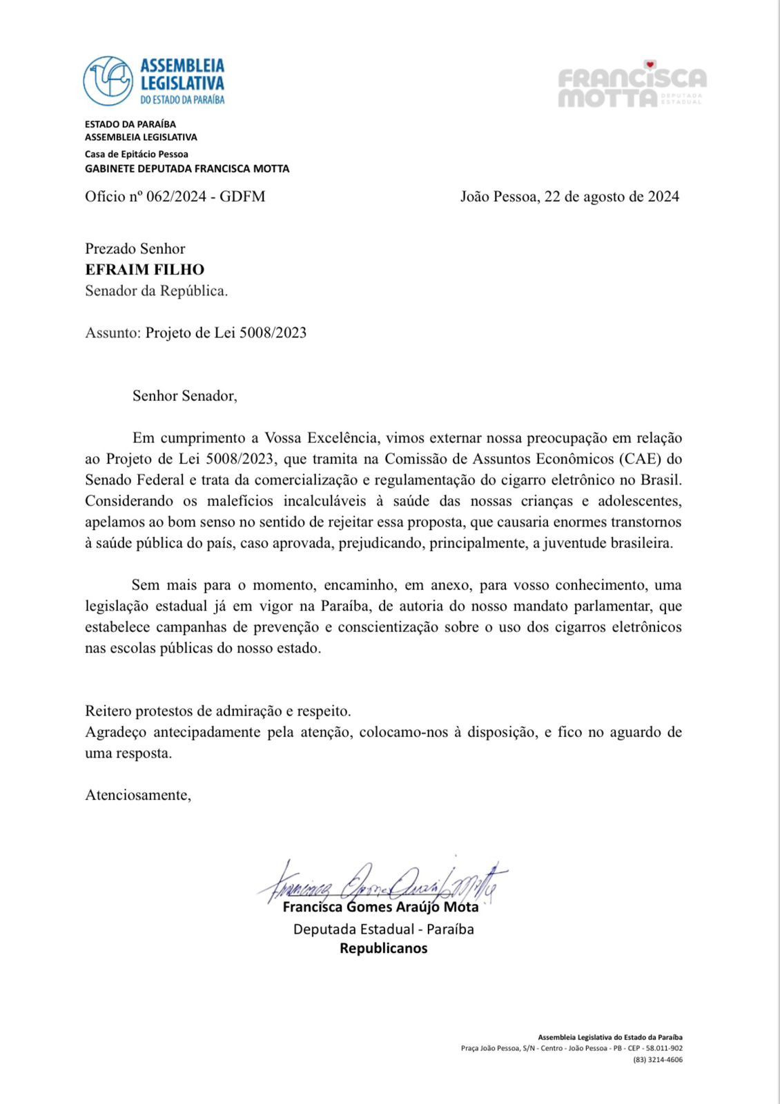 Conforme antecipado em plenário, a deputada estadual Francisca Motta (Republicanos) oficializou hoje (22), pedido aos senadores paraibanos para que rejeitem projeto que tramita no Senado Federal, com o objetivo de regulamentar a produção e comercialização dos cigarros eletrônicos no Brasil.