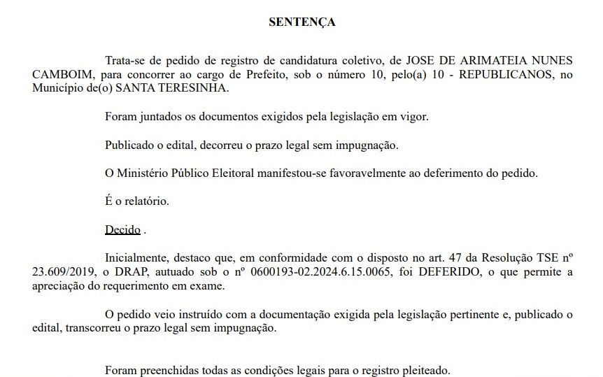 Portanto, à justiça eleitoral confirma que o candidato José de Arimateia Numes Camboim(Republicanos) está apto, ou seja, liberado para disputar o pleito de 6 de outubro de 2024.
