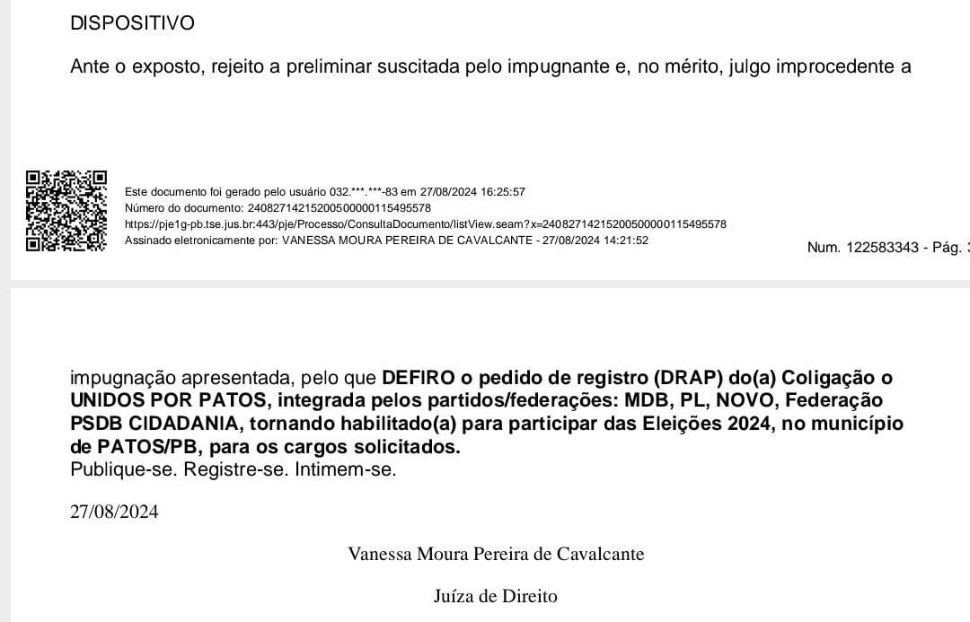 A Justiça confirmou, portanto, que a coligação 'Unidos por Patos' está habilitada para participar das eleições municipais de 2024. Veja a decisão no documento abaixo: