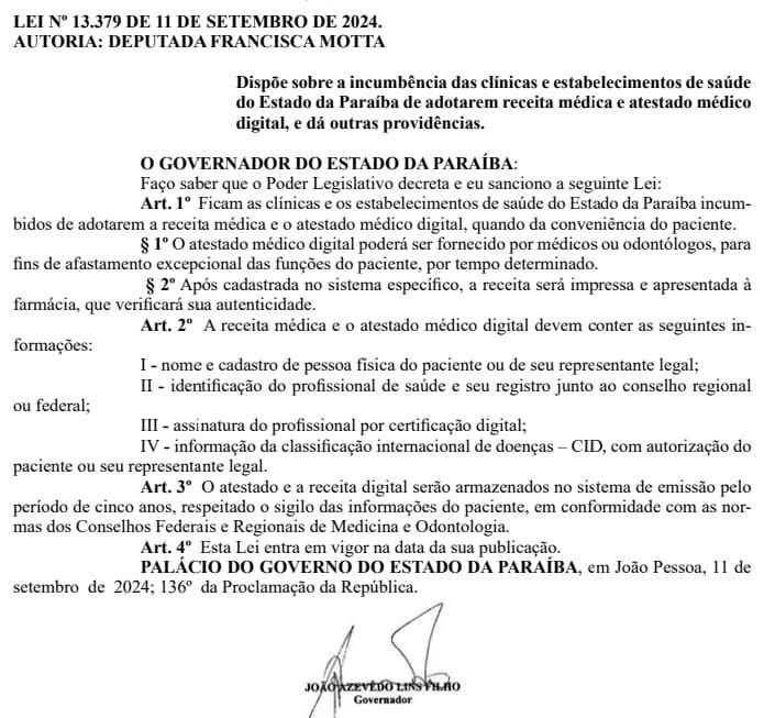 Nesta quarta-feira, 11 de setembro de 2024, foi sancionada pelo governador da Paraíba a Lei n° 13.379, de autoria da deputada estadual Francisca Motta (Republicanos). A nova legislação impõe que clínicas e estabelecimentos de saúde em todo o estado adotem a receita médica e o atestado digital, de acordo com a necessidade do paciente.