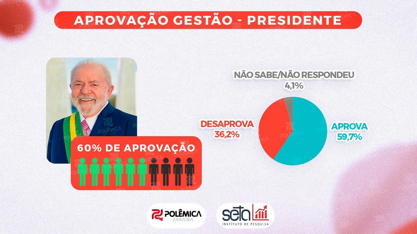O estudo também avaliou a percepção dos eleitores sobre o governo federal. Segundo os dados, o presidente Luiz Inácio Lula da Silva (PT) tem aprovação de 60% no estado, índice que confirma o apoio da maioria da população paraibana à condução do governo em Brasília.