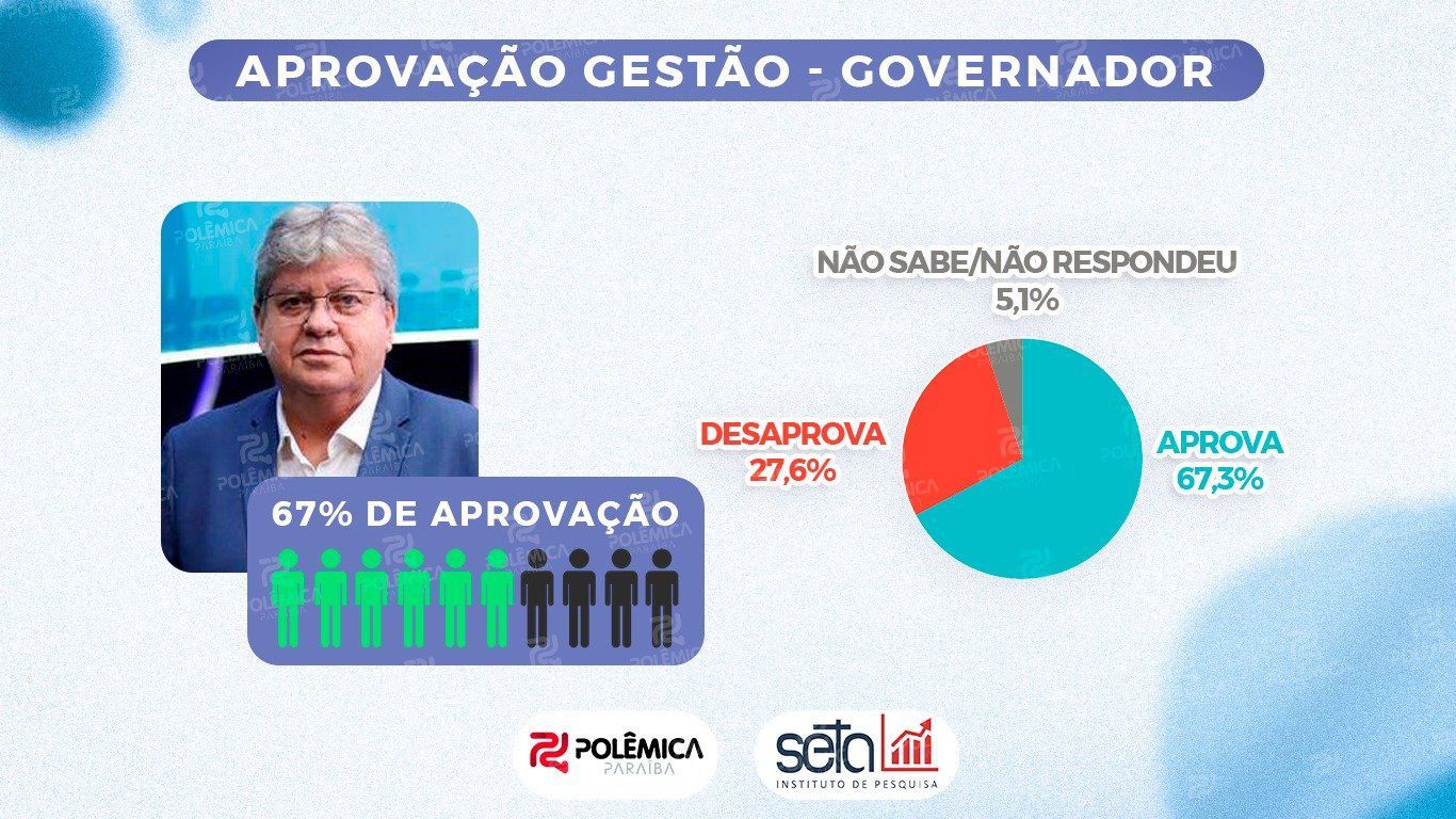Uma pesquisa realizada pelo instituto Seta em parceria com o portal Polêmica Paraíba revelou que o governador João Azevêdo (PSB) mantém alta popularidade entre os paraibanos. O levantamento, feito entre os dias 28 e 30 de setembro em 90 municípios, apontou que 67% dos entrevistados aprovam a gestão estadual.