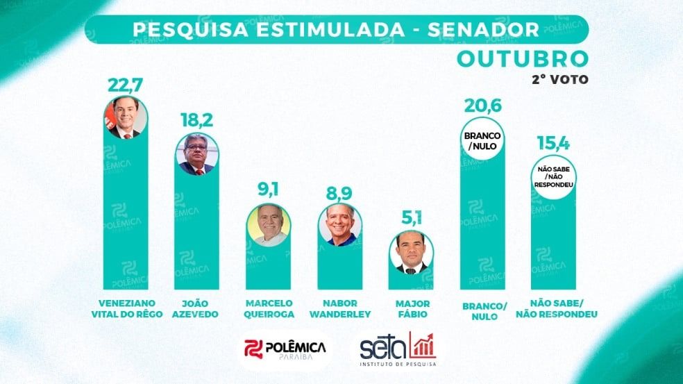 Quando o levantamento simula o segundo voto para o Senado, o quadro se inverte. Veneziano lidera com 22,7%, seguido de João Azevêdo, que aparece com 18,2%. Logo atrás vêm Marcelo Queiroga (9,1%), Nabor Wanderley (8,9%) e Major Fábio (5,1%).