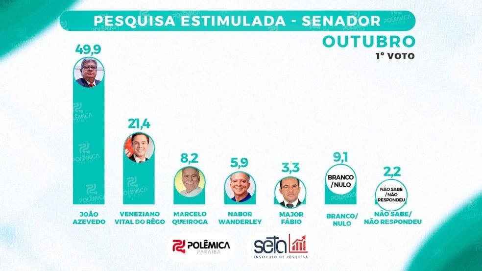 No cenário do primeiro voto, o governador João Azevêdo aparece com ampla vantagem, registrando 49,9% das intenções. Em segundo lugar está o senador Veneziano Vital do Rêgo, com 21,4%, seguido por Marcelo Queiroga (8,2%), Nabor Wanderley (5,9%) e Major Fábio (3,3%).