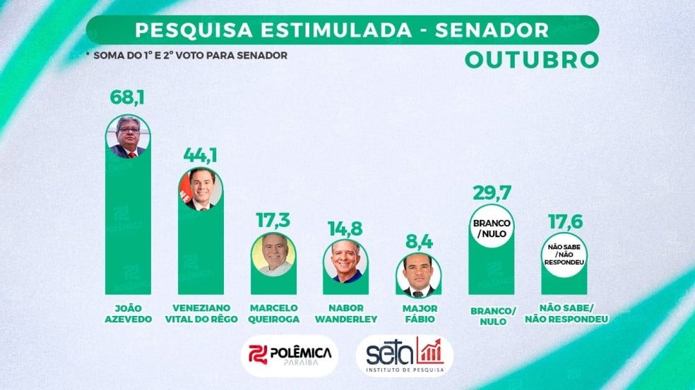 Ao somar as intenções de voto para o primeiro e segundo senador, o levantamento aponta o potencial total de cada nome. Nesse cenário, João Azevêdo desponta na liderança com 68,1% das menções. Em seguida, aparece Veneziano Vital do Rêgo, com 44,1%. Na sequência, vêm Marcelo Queiroga (17,3%), Nabor Wanderley (14,8%) e Major Fábio (8,4%).